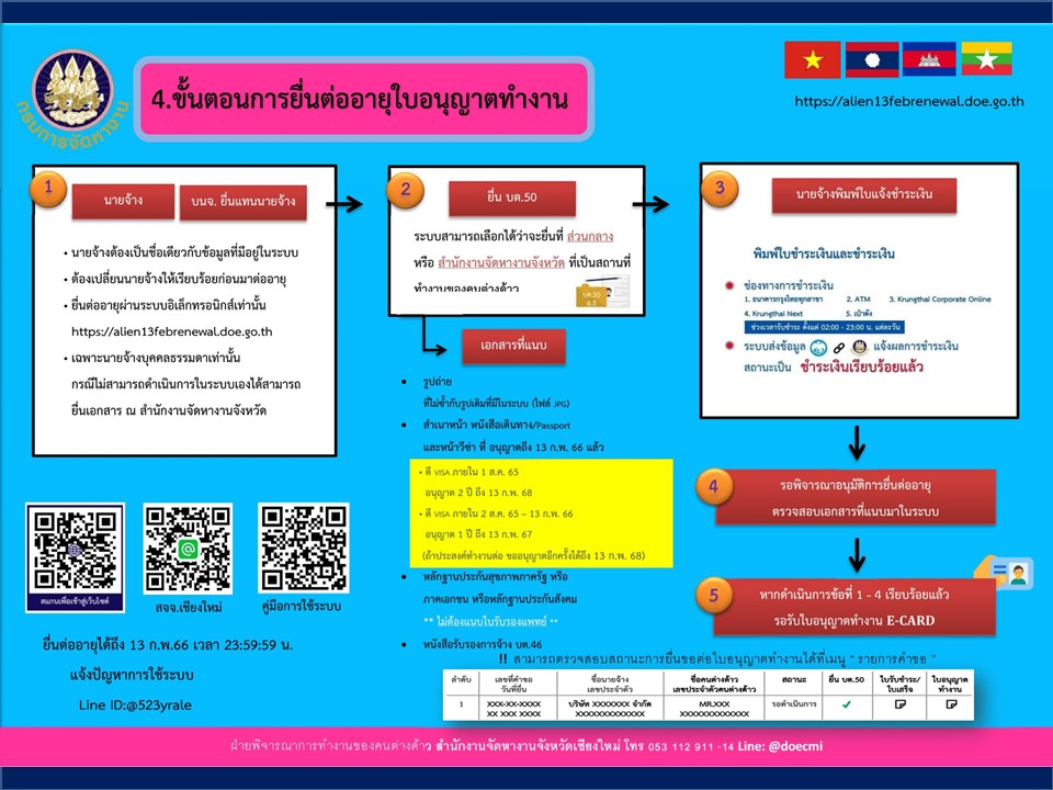สำนักงานจัดหางานเชียงใหม่ เปิดให้บริการต่อใบอนุญาตทำงานของแรงงานต่างด้าว 4 สัญชาติ คือ กัมพูชา ลาว เมียนมา และเวียดนาม ถึงวันที่ 13 กุมภาพันธ์ 2566