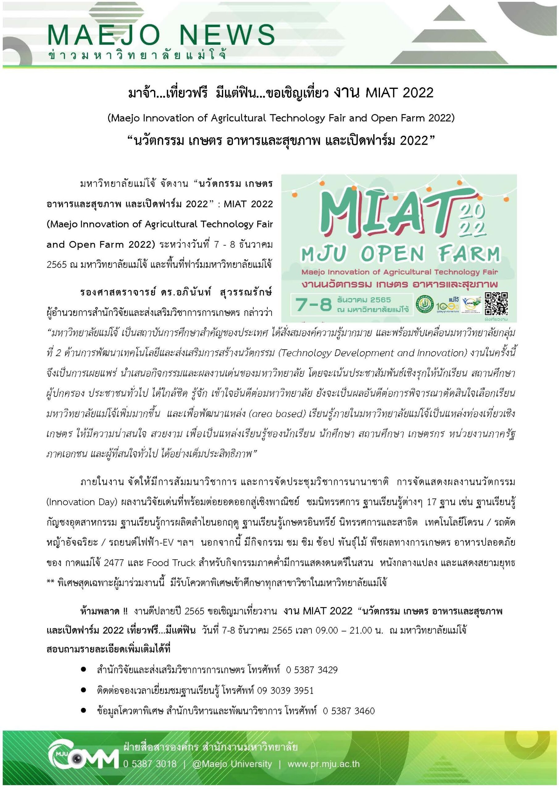 มหาวิทยาลัยแม่โจ้ จัดงาน “นวัตกรรม เกษตร อาหารและสุขภาพ และเปิดฟาร์ม 2022” : MIAT 2022 (Maejo Innovation of Agricultural Technology Fair and Open Farm 2022) ระหว่างวันที่ 7 – 8 ธันวาคม 2565 ณ มหาวิทยาลัยแม่โจ้ และพื้นที่ฟาร์มมหาวิทยาลัยแม่โจ้