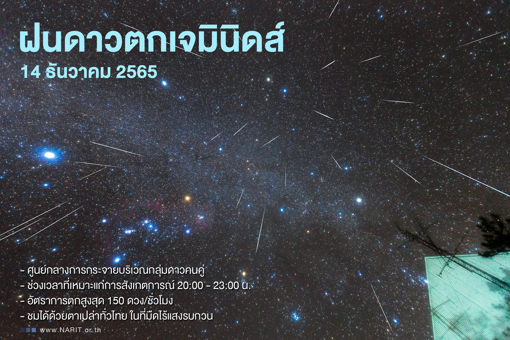 สถาบันวิจัยดาราศาสตร์แห่งชาติ (องค์การมหาชน) (สดร.) กระทรวงการอุดมศึกษา วิทยาศาสตร์ วิจัยและนวัตกรรม (อว.) เผยคืน 14 ธันวาคม 2565 มีปรากฏการณ์ “ฝนดาวตกเจมินิดส์” เริ่มสังเกตได้ตั้งแต่เวลาประมาณ 20:00 น. เป็นต้นไป อัตราการตกสูงสุด 150 ดวงต่อชั่วโมง ชมได้ด้วยตาเปล่าทุกภูมิภาคทั่วไทยในพื้นที่มืดสนิท เตรียมจัดสังเกตการณ์ในเขตอนุรักษ์ท้องฟ้ามืด ณ อ่างเก็บน้ำห้วยลาน อ. สันกำแพง จ. เชียงใหม่ และหอดูดาวเฉลิมพระเกียรติ 7 รอบ พระชนมพรรษา นครราชสีมา และฉะเชิงเทรา