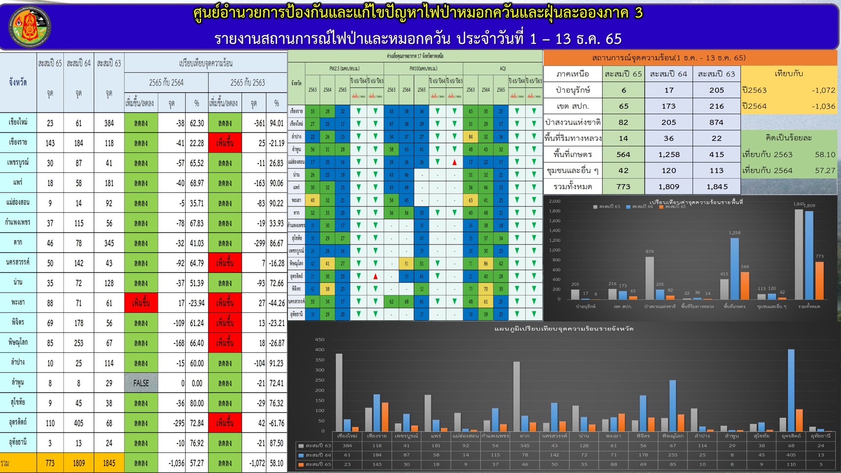 ขณะที่ ศูนย์อำนวยการป้องกันและแก้ไขปัญหาไฟป่าหมอกควันและฝุ่นละอองภาค 3 (ศอ.ปกป.ภาค3)​ รายงานสถานการณ์ ไฟป่าหมอกควันและฝุ่นละอองในพืนที่ 17 จังหวัดภาคเหนือประจำวันที่ 13 ธ.ค.65 เวลา 1500 พบว่าในพื้นที่เกิดจุดความร้อน จำนวน 46 จุด สูงสุด ที่จังหวัดอุตรดิตถ์ รองลงคือ เชียงราย เชียงใหม่ ในส่วนของ ฝุ่นละอองขนาดเล็ก PM 2.5, PM 10 และ AQI อยู่ในเกณฑ์ ปานกลางถึงดีมาก ทั้งนี้ภาพรวมจุดความร้อน ตั้งแต่ 1 – 13 ธ.ค.65 เมื่อเปรียบเทียบกับปี 64 ในห้วงเวลาเดียวกันจังหวัดพะเยามีแนวโน้มเพิ่มขึ้น