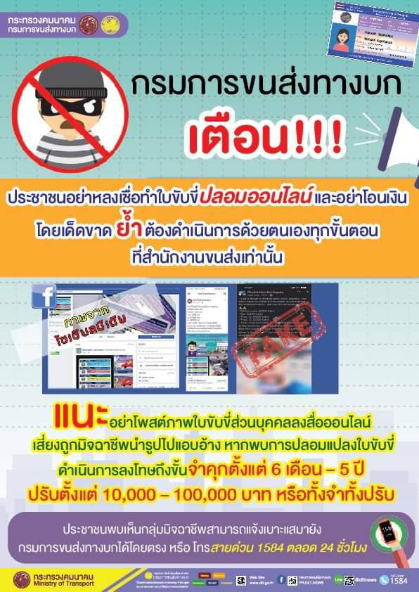 “ปัจจุบันมีกลุ่มมิจฉาชีพแอบอ้างว่าสามารถรับจัดทำหรือต่ออายุใบขับขี่รถยนต์บนแพลตฟอร์มออนไลน์ต่างๆ โดยเฉพาะบนเพจเฟซบุ๊กซึ่งมีประชาชนถูกหลอกเป็นจำนวนมาก ซึ่งการกระทำดังกล่าวเป็นการหลอกลวงนำเข้าสู่ระบบคอมพิวเตอร์ซึ่งข้อมูลปลอมตามมาตรา 14 แห่งพระราชบัญญัติว่าด้วยการกระทำความผิดเกี่ยวกับคอมพิวเตอร์ พ.ศ. 2560 และยังเป็นความผิดตามมาตรา 6 และมาตรา 7 แห่งพระราชบัญญัติเครื่องหมายราชการพุทธศักราช 2482 กรมการขนส่งทางบกขอเตือนว่าอย่าหลงเชื่อเด็ดขาด และย้ำว่าการขอรับใบอนุญาตขับรถทุกชนิดมีมาตรฐานเดียวกันทั่วประเทศ คือ ผู้ขอรับใบอนุญาตขับรถต้องดำเนินการด้วยตนเองทุกขั้นตอนที่สำนักงานขนส่ง ตั้งแต่การตรวจสอบเอกสาร การทดสอบสมรรถภาพของร่างกาย การอบรม การทดสอบข้อเขียน การทดสอบขับรถ และการถ่ายรูปเพื่อออกใบอนุญาตขับรถ ซึ่งอัตราค่าธรรมเนียมตามกฎหมายกำหนด (รวมค่าคำขอ) ในการขอรับใบอนุญาตขับรถยนต์ส่วนบุคคลชั่วคราว 205 บาท อัตราค่าธรรมเนียมในการต่ออายุใบอนุญาตขับรถยนต์ส่วนบุคคล 505 บาท อัตราค่าธรรมเนียมในการขอรับใบอนุญาตขับรถจักรยานยนต์ชั่วคราว 105 บาท และอัตราค่าธรรมเนียมในการต่อใบอนุญาตขับรถจักรยานยนต์ส่วนบุคคล 255 บาท สำหรับผู้ที่ต้องการขอใหม่หรือการต่ออายุใบอนุญาตขับรถสามารถจองคิวล่วงหน้าผ่านแอปพลิเคชัน DLT Smart Queue ซึ่งสามารถเลือกสำนักงานขนส่ง วันที่ และเวลาที่สะดวกได้ด้วยตนเอง