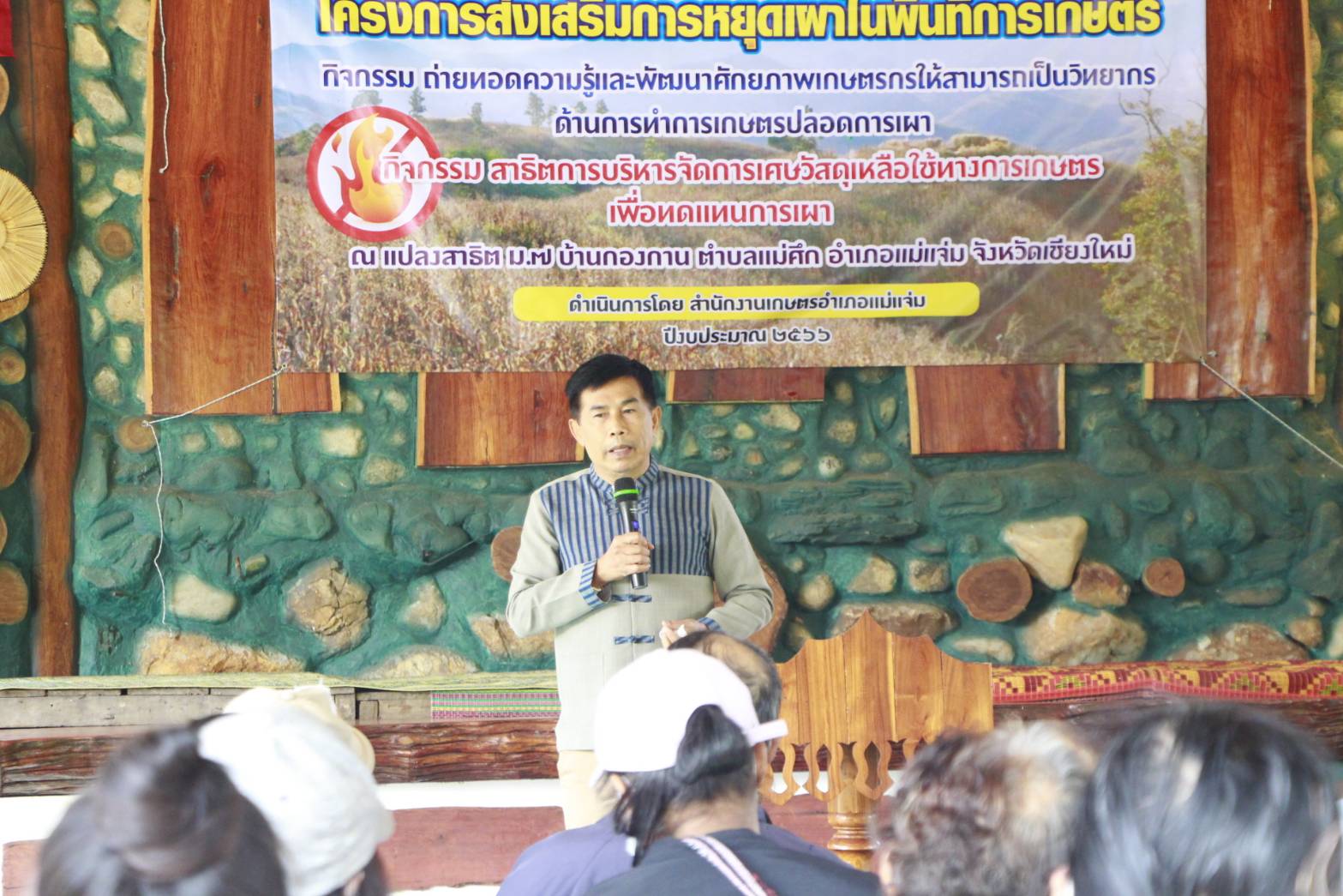 นายเจริญ พิมพ์ขาล เกษตรจังหวัดเชียงใหม่ กล่าวว่า กรมส่งเสริมการเกษตร กระทรวงเกษตรและสหกรณ์ ให้ความสำคัญกับการแก้ไขปัญหาส่งเสริมหยุดเผาในพื้นที่เกษตร มุ่งเป้าสร้างการมีส่วนร่วมของชุมชนในการแก้ไขปัญหาการเผาในพื้นที่เกษตร โดยการสร้างความตระหนักรู้ในข้อเสียของการเผาซึ่งนอกจากจะทำลายสิ่งแวดล้อม สุขภาพ และยังสูญเสียธาตุอาหารในการเจริญเติยโตของพืช พร้อมกันนั้นสร้างเครือข่ายปลอดการเผาพร้อมถ่ายทอดความรู้การทำเกษตรปลอดการเผาการจัดการวัสดุเหลือใช้เพิ่มมูลค่า พืชทางเลือกเพิ่มมูลค่าหรือพืชมูลค่าสูงอีกทั้งร่วมรณรงค์เผยแพร่สร้างความตระหนักรู้โดยใช้ BCG MODEL บริหารจัดการโดยใช้เทคโนโลยีบริหารจัดการทั้งต้นน้ำกลางน้ำปลายน้ำ พร้อมความร่วมมือจาก หน่วยงานบูรณการดังในวันนี้ที่ได้รับความร่วมมือจากสถานีพ้ฒนาที่ดิน สหกรณ์การเกษตรแม่แจ่ม ร่วมให้ความรู้กับเกษตรกร ทั้งการใช้การเขตกรรมไถกลบในพื้นที่ราบ หรือแปรเป็นพลังงานชีวมวล การผลิตปุ๋ย หรือแม้กระทั่งอัดก้อน สามารถช่วยเกษตรกรลดต้นทุน แปรเปลี่ยนเป็นมูลค่าเพิ่มสร้างรายได้แก่เกษตรอีกช่องทางหนึ่ง