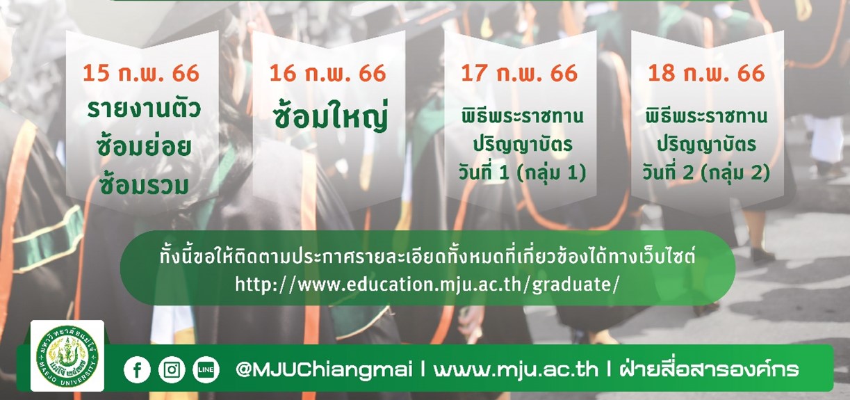 สำหรับ บัณฑิต มหาบัณฑิต และดุษฎีบัณฑิต สามารถตรวจสอบรายชื่อและพิมพ์แบบฟอร์มสำหรับยืนยันตัวตน ในวันที่ 10 กุมภาพันธ์ 2566 ที่เว็บไซต์ http://www.education.mju.ac.th/graduate/ และให้มารายงานตัวด้วยตนเองตามกำหนดการอีกครั้ง ณ มหาวิทยาลัยแม่โจ้