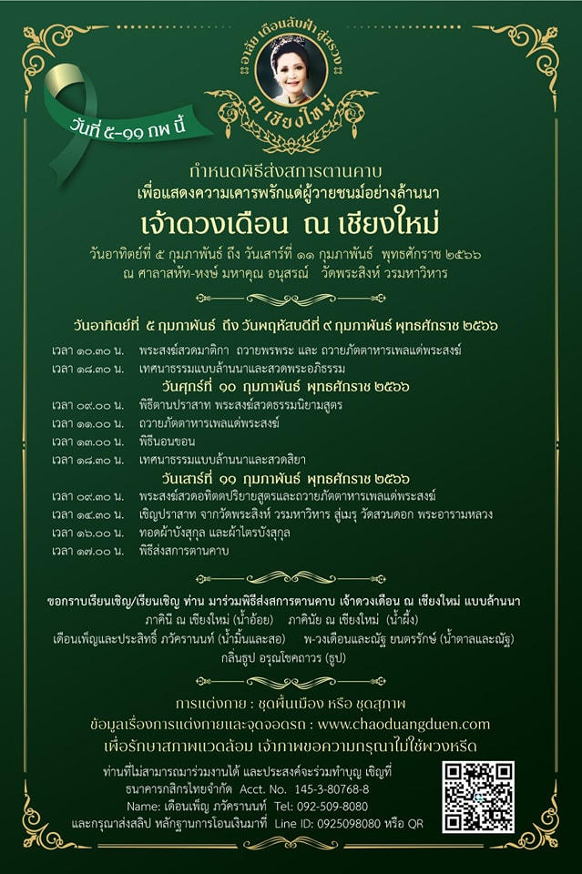 คณะทายาทเจ้าดวงเดือน ณ เชียงใหม่ ร่วมกับ เครือข่ายวัฒนธรรม เตรียมจัดพิธีบำเพ็ญกุศล เจ้าดวงเดือน ณ เชียงใหม่ “อาลัย เดือนลับฟ้า สู่สรวง” ตามจารีตของชาวล้านนา ระหว่างวันที่ 5-11 กุมภาพันธ์ นี้
