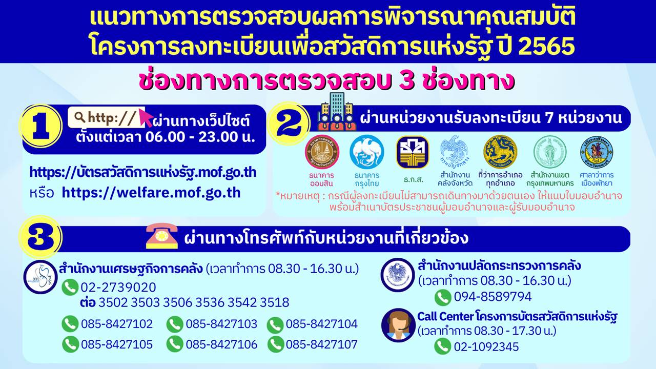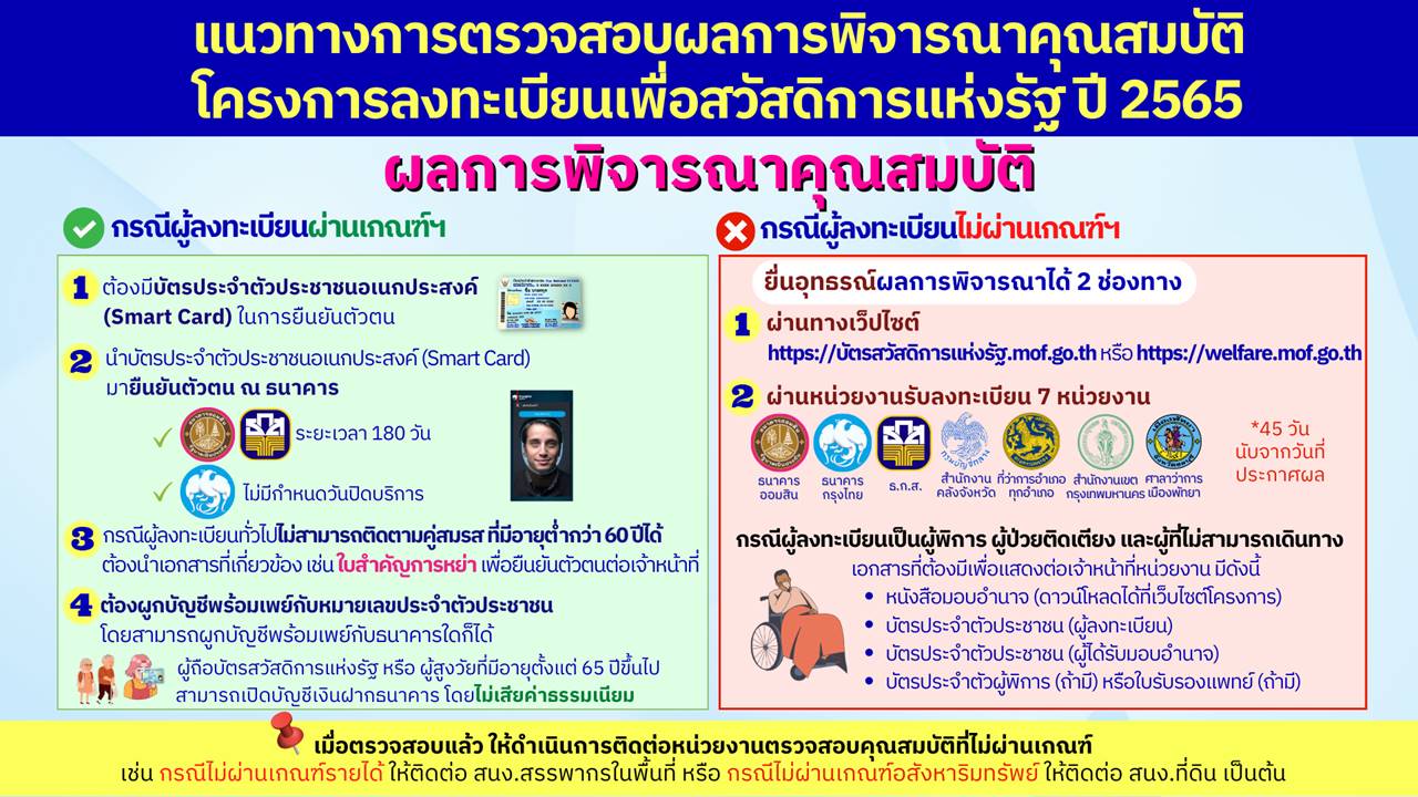 อย่างไรก็ตาม แนวทางการตรวจสอบผลการพิจารณาคุณสมบัติ และการใช้จ่ายใน “โครงการลงทะเบียนเพื่อสวัสดิการแห่งรัฐ ปี 2566” ได้แตกต่างไปจากเดิมอย่างสิ้นเชิง โดยในรอบนี้ ประชาชนสามารถตรวจสอบผลการพิจารณาคุณสมบัติได้ ผ่าน 3 ช่องทาง ได้แก่ เว็บไซต์ : บัตรสวัสดิการแห่งรัฐ.mof.go.th ในเวลา 06.00-23.00 น. , หน่วยงานรับลงทะเบียน 7 หน่วยงาน และโทรศัพท์กับหน่วยงานที่เกี่ยวข้อง ส่วนการใช้จ่ายจะเปลี่ยนจากการใช้จ่ายผ่านบัตรสวัสดิการแห่งรัฐเป็นการใช้จ่ายผ่านบัตรประจำตัวประชาชนที่เป็น Smart Card โดยการผูกบัญชีพร้อมเพย์กับเลขบัตรประจำตัวประชาชน ซึ่งหากผู้ถือบัตรสวัสดิการแห่งรัฐหรือผู้สูงอายุ 65 ปีขึ้นไป ไม่มีบัญชีธนาคาร สามารถไปเปิดบัญชีเงินฝากขั้นต่ำ 0 บาท เพื่อการเข้าถึงบริการทางการเงินขั้นพื้นฐาน กับธนาคารใดก็ได้ นอกจากนี้ สำนักงานคลังจังหวัดเชียงใหม่ ได้มีการประสานไปยังธนาคารต่าง ๆ ในการเปิดจุดแยกบริการสำหรับ “โครงการลงทะเบียนเพื่อสวัสดิการแห่งรัฐ ปี 2566” โดยเฉพาะ เพื่ออำนวยความสะดวกแก่ประชาชนอย่างมากที่สุด
