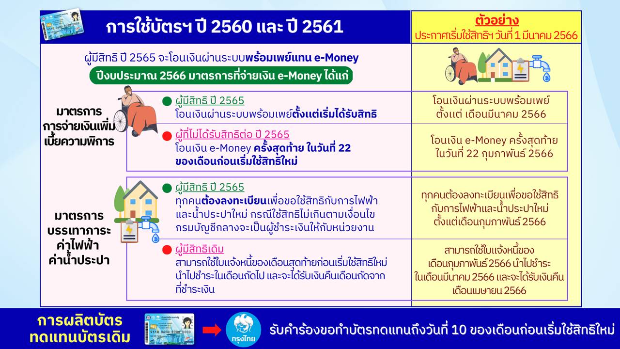สำหรับผู้มีสิทธิอยู่เดิม สามารถใช้งานบัตรได้ถึงเวลา 22.00 น. ของวันสุดท้ายก่อนที่จะเริ่มใช้สิทธิใหม่ ส่วนวงเงินใน e-money ก็สามารถใช้งานได้ภายใน 180 วัน นับตั้งแต่วันที่เริ่มใช้สิทธิใหม่ด้วยบัตรประจำตัวประชาชน ทั้งนี้ ขอเน้นย้ำไปยังร้านธงฟ้าที่ต้องการคืนเครื่อง EDC ว่า “กรมบัญชีกลาง และ สำนักงานคลังจังหวัด ไม่มีนโยบายโทรสอบถามข้อมูลส่วนตัวของร้านค้าใด ๆ ทั้งสิ้น อย่าหลงเชื่อมิจฉาชีพที่หลอกลวงถามข้อมูลส่วนบุคคล”