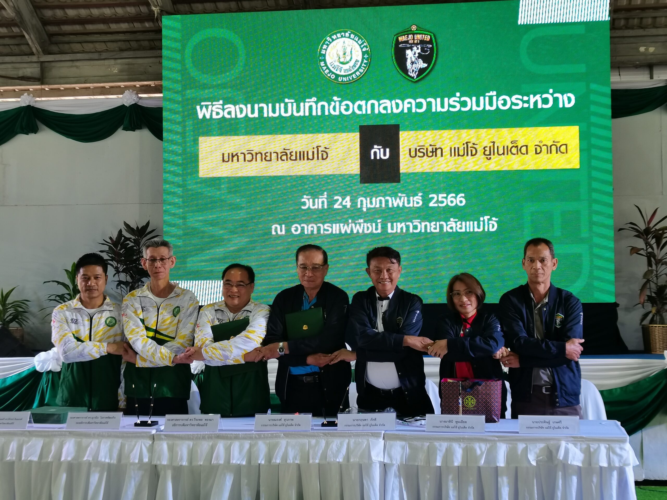 วันศุกร์ที่ 21 กุมภาพันธ์ 2566 มหาวิทยาลัยแม่โจ้ จัดพิธีลงนามบันทึกข้อตกลงความร่วมมือ กับ บริษัท แม่โจ้ ยูไนเต็ด จำกัด โดยมี รองศาสตราจารย์ ดร.วีระพล ทองมา อธิการบดีมหาวิทยาลัยแม่โจ้ และ นายณรงค์ สุวภาพ และ นายกฤษดา ภักดี กรรมการบริษัท แม่โจ้ ยูไนเต็ด จำกัด เป็นผู้แทนลงนามของทั้งสองฝ่าย พร้อมด้วยคณะผู้บริหารของทั้ง 2 หน่วยงานร่วมเป็นสักขีพยาน ณ อาคารแผ่พืชน์ มหาวิทยาลัยแม่โจ้ จ.เชียงใหม่