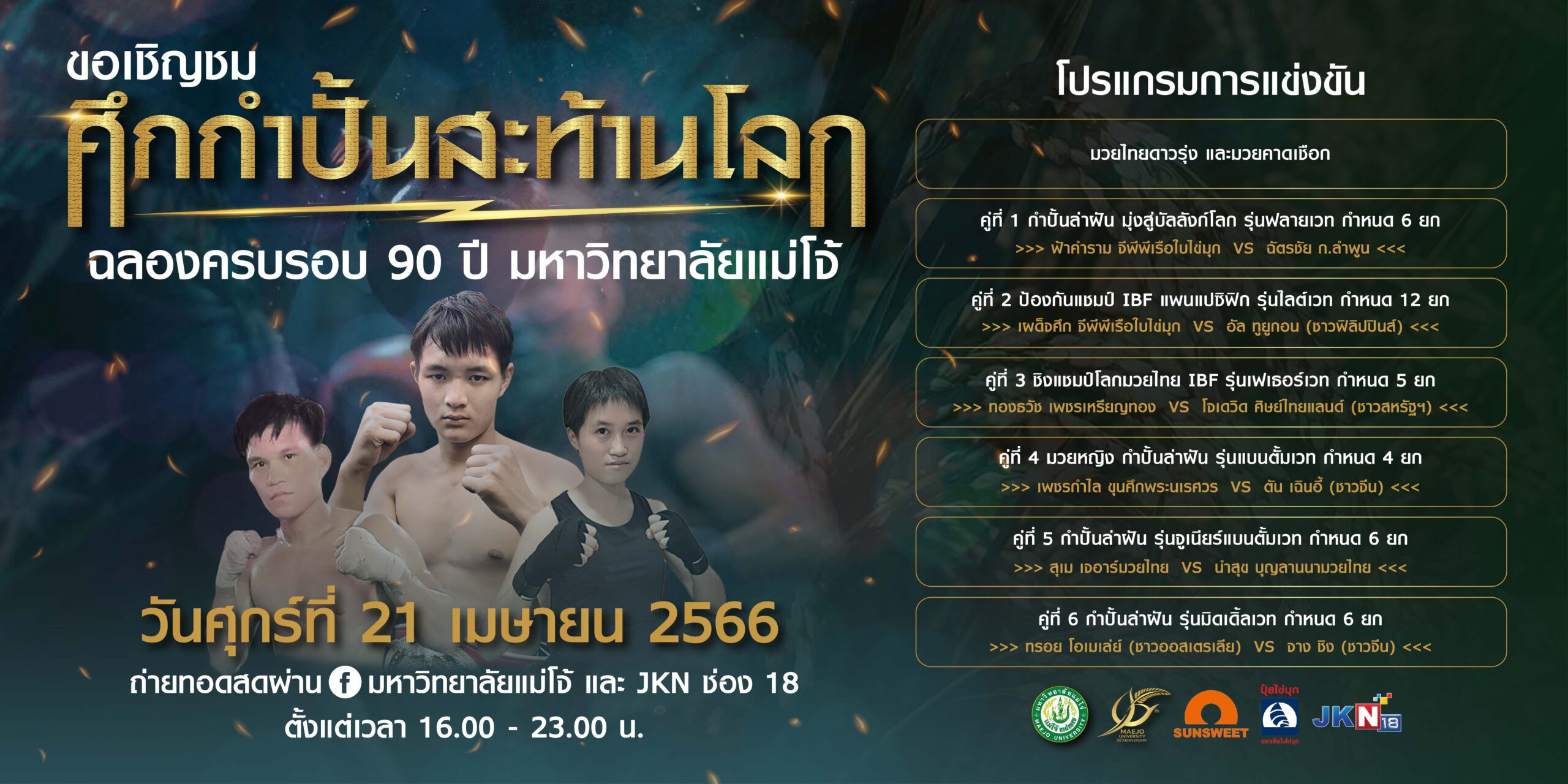 สำหรับการจัดการแข่งขันในครั้งนี้ มีรายการหลัก 6 คู่ มีการประกบคู่เอก รายการป้องกันแชมป์ IBF แพนแปซิฟิกรุ่นไลต์เวท ระหว่าง เผด็จศึก จีพีพีเรือใบไข่มุก (แชมป์ IBF แพนแปซิฟิก) พบกับ อัล ทูยูกอน (ผู้ท้าชิงชาวฟิลิปปินส์) นอกจากนั้นยังจัดการแข่งขันชิงแชมป์โลกมวยไทย IBF รุ่นเฟเธอร์เวท, การแข่งขันมวยหญิง กำปั้นล่าฝันรุ่นแบนตั้มเวท กำหนด 4 ยก , การแข่งขันกำปั้นล่าฝัน มุ่งสู่บัลลังก์โลก รุ่นฟลายเวท กำหนด 6 ยก, กำปั้นล่าฝันรุ่นจูเนียร์แบนตั้มเวท กำหนด 6 ยก และ กำปั้นล่าฝันรุ่นมิดเดิ้ลเวท กำหนด 6 ยก รวมถึงการชกมวยไทยดาวรุ่ง และมวยคาดเชือก อีกหลายคู่