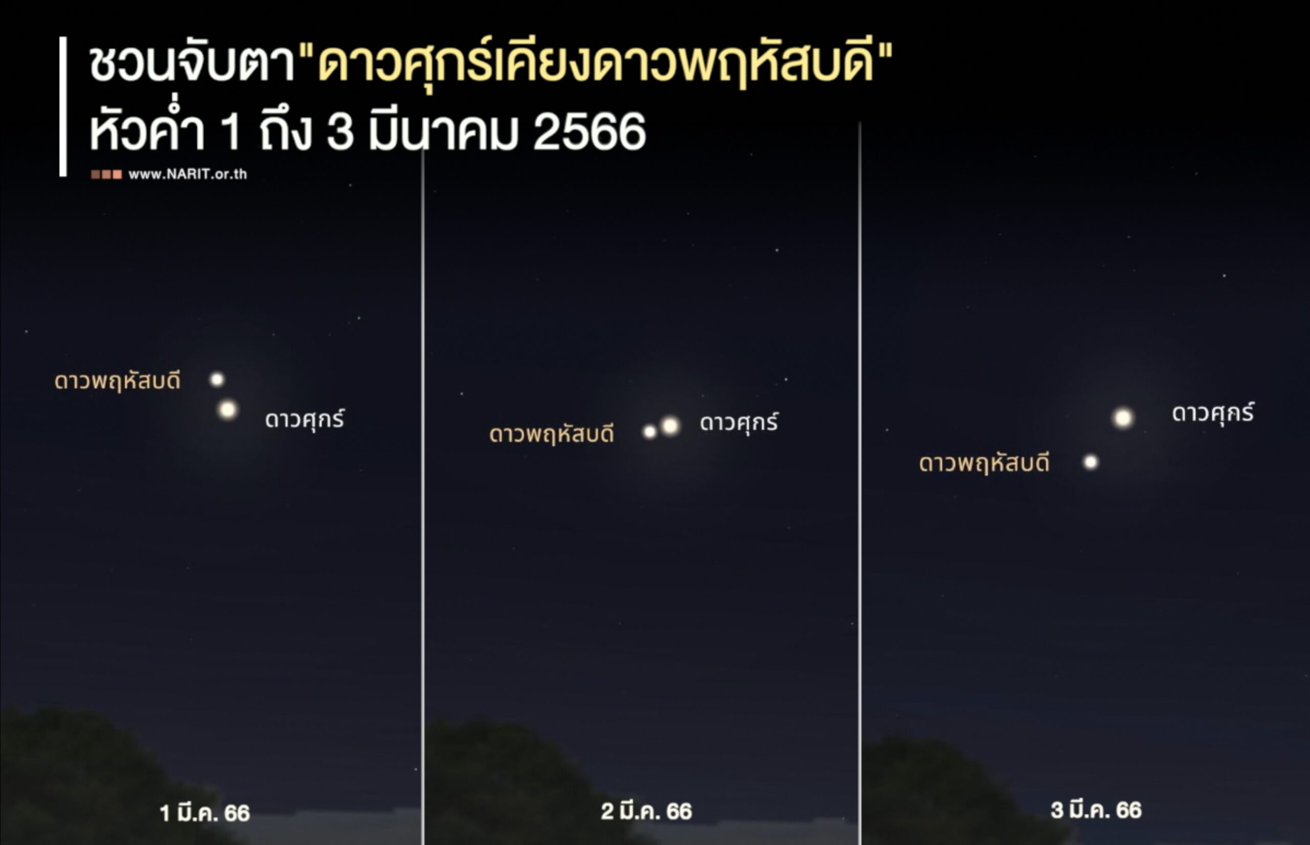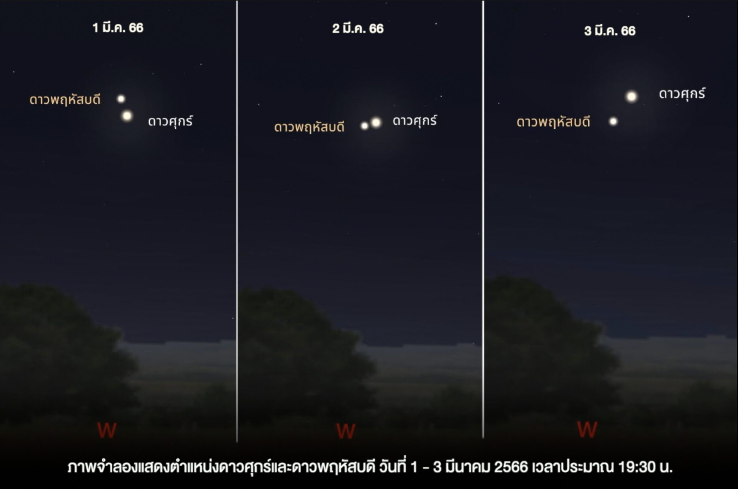 นายศุภฤกษ์ คฤหานนท์ ผู้อำนวยศูนย์บริการวิชาการและสื่อสารทางดาราศาสตร์ เปิดเผยว่า ช่วงวันที่ 1 ถึง 3 มีนาคม 2566 จะเกิดปรากฏการณ์ “ดาวเคราะห์ชุมนุม” ดาวศุกร์ปรากฏเคียงดาวพฤหัสบดี ทางทิศตะวันตกบริเวณกลุ่มดาวปลาคู่ (Pisces) หลังดวงอาทิตย์ลับขอบฟ้าเป็นต้นไป จนถึงเวลาประมาณ 20.00 น. สังเกตได้ด้วยตาเปล่าทุกภูมิภาคทั่วประเทศ ในวันที่ 1 มีนาคม 2566 ดาวพฤหัสบดีจะปรากฏอยู่เหนือดาวศุกร์ ห่างประมาณ 0.8 องศา จากนั้นวันที่ 2 มีนาคม 2566 ดาวศุกร์จะเปลี่ยนตำแหน่งมาปรากฏเคียงดาวพฤหัสบดี ห่างกันประมาณ 0.6 องศา และในวันที่ 3 มีนาคม 2566 ดาวศุกร์จะปรากฏอยู่เหนือดาวพฤหัสบดี ห่างกันประมาณ 1.4 องศา และค่อย ๆ ทำมุมห่างออกจากกันมากขึ้นหลังจากนี้ ผู้สนใจชมปรากฏการณ์ดังกล่าว สามารถสังเกตเห็นได้โดยง่ายเนื่องจากดาวเคราะห์ทั้งสองมีความสว่างโดดเด่นมากบนท้องฟ้าในช่วงหัวค่ำ
