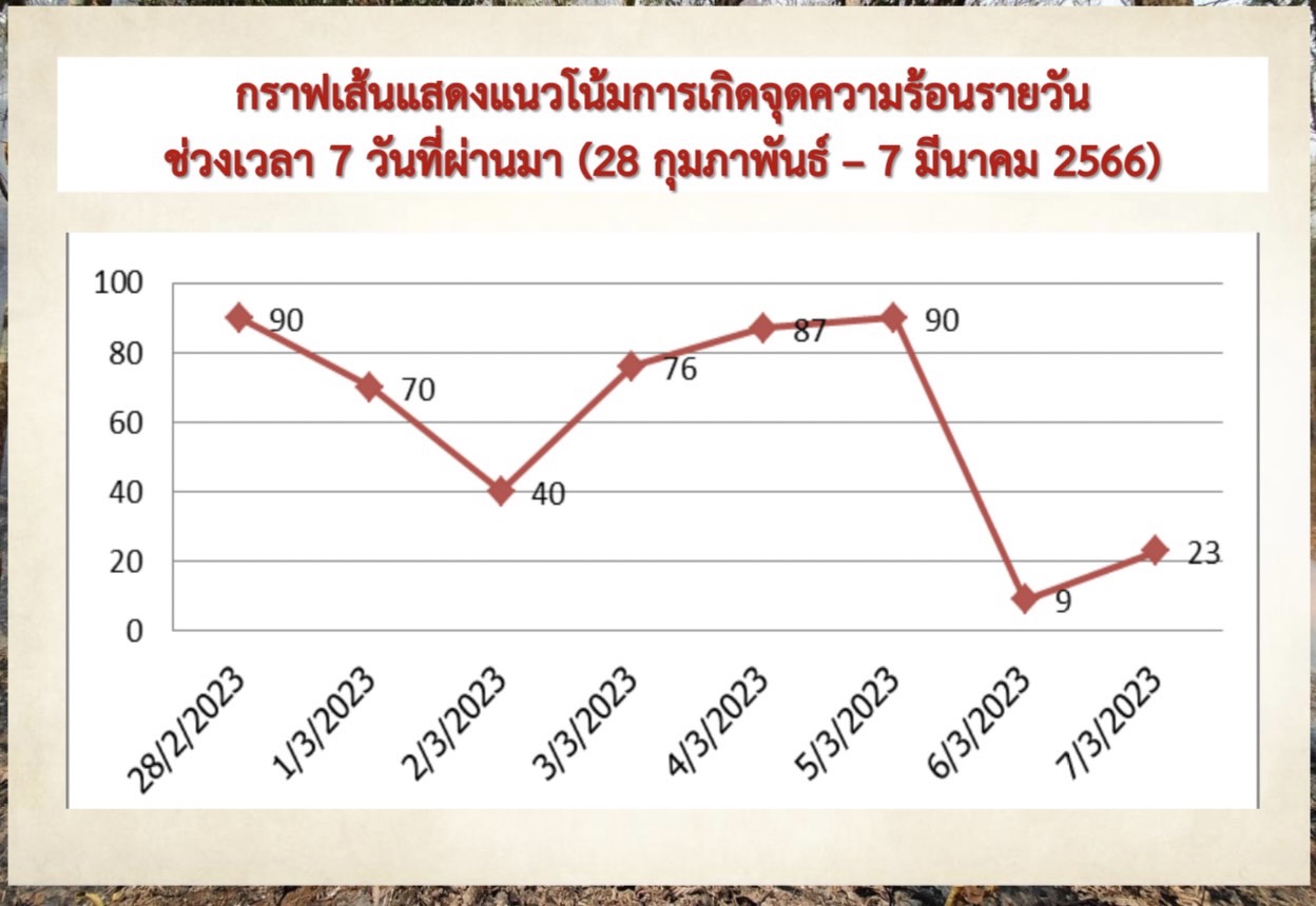 อย่างไรก็ตาม สถิติการเกิดจุดความร้อนในห้วง 7 วันที่ผ่านมา ระหว่างวันที่ 28 กุมภาพันธ์ – 7 มีนาคม 2566 พบว่า ปัจจุบันมีจุดความร้อน จำนวน 23 จุด ซึ่งลดลงจากวันที่ 28 กุมภาพันธ์ 2566 ที่มีจุดความร้อนสูงถึง 90 จุด ทั้งนี้ แม้การเกิดจุดความร้อนในพื้นที่จะลดลง แต่ปริมาณค่าฝุ่น PM2.5 ยังคงมีปริมาณที่สูงนั้น เป็นผลมาจากสภาพอากาศและการพัดพาฝุ่นมาจากพื้นที่อื่น โดยหลังจากนี้สถานการณ์จะดีขึ้นอย่างต่อเนื่อง จากการไหลเวียนของอากาศที่ดีขึ้น