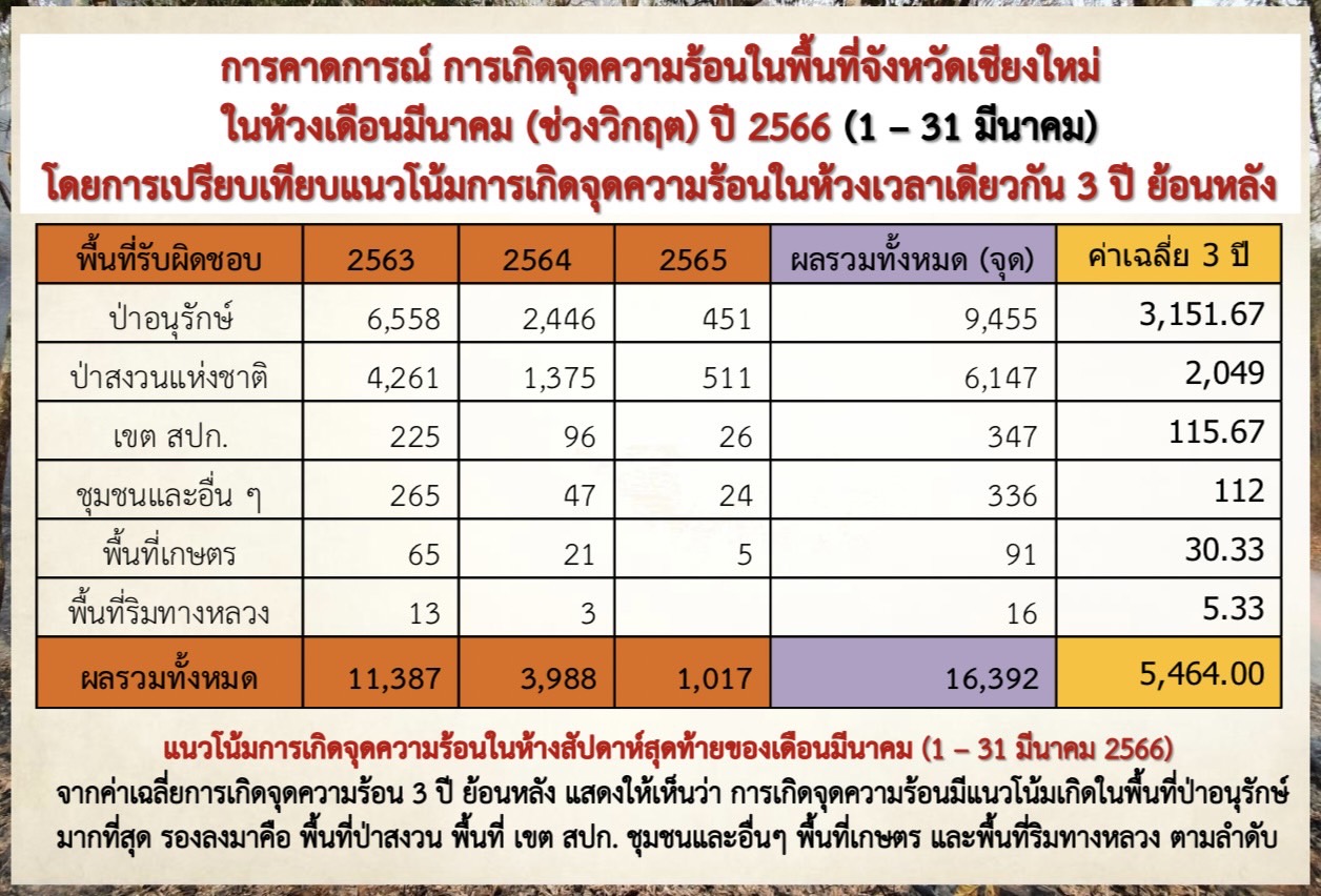 วันนี้ (7 มี.ค. 66) ที่ ห้องประชุม 4 ชั้น 4 อาคารอำนวยการ ศาลากลางจังหวัดเชียงใหม่ นายอิศเรศ สิทธิโรจนกุล ผู้อำนวยการสำนักงานทรัพยากรธรรมชาติและสิ่งแวดล้อมจังหวัดเชียงใหม่ เปิดเผยถึงสถานการณ์ไฟป่าและฝุ่นละอองขนาดเล็ก PM2.5 ในพื้นที่จังหวัดเชียงใหม่ ว่า ตั้งแต่ห้วงวันที่ 1 มกราคม – 7 มีนาคม 2566 จังหวัดเชียงใหม่ มีจุดความร้อน (Hotspot) สะสมแล้วจำนวน 3,405 จุด ซึ่งเพิ่มขึ้นจากปี 2565 ร้อยละ 56.18 เมื่อเปรียบเทียบกับช่วงเวลาเดียวกัน ทั้งนี้เป็นผลมาจากสภาพพื้นที่ซึ่งมีความแห้งแล้งกว่าปีที่ผ่านมาซึ่งมีปริมาณฝนตกตกลงมาเป็นจำนวนมาก