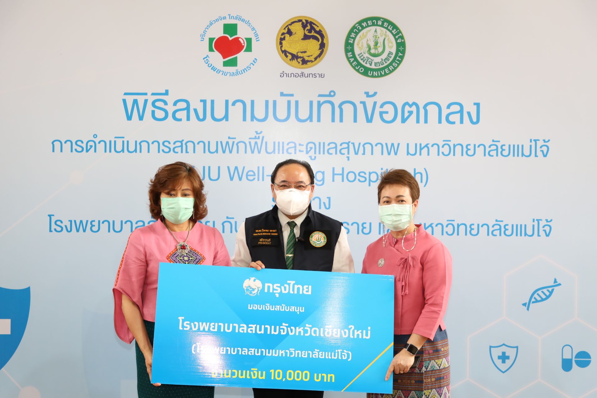 ในโอกาสเดียวกันนี้ คุณสุรินทร์ แสนเจริญ ผู้จัดการส่วนคลังน้ำมันเชียงใหม่ บริษัท ปตท. น้ำมันและการค้าปลีก จำกัด (มหาชน) มอบเงินสนับสนุนโรงพยาบาลสนาม มหาวิทยาลัยแม่โจ้ จำนวน 500,000 บาท และ คุณสุพรรณ อ่องสกุล ผจก.สำนักงานเขต เชียงใหม่ 2 ธนาคารกรุงไทย จำกัด (มหาชน) มอบเงินสนับสนุน 10,000 บาท โดยมี รองศาสตราจารย์ ดร.วีระพล ทองมา อธิการบดี มหาวิทยาลัยแม่โจ้ เป็นผู้แทนรับมอบ