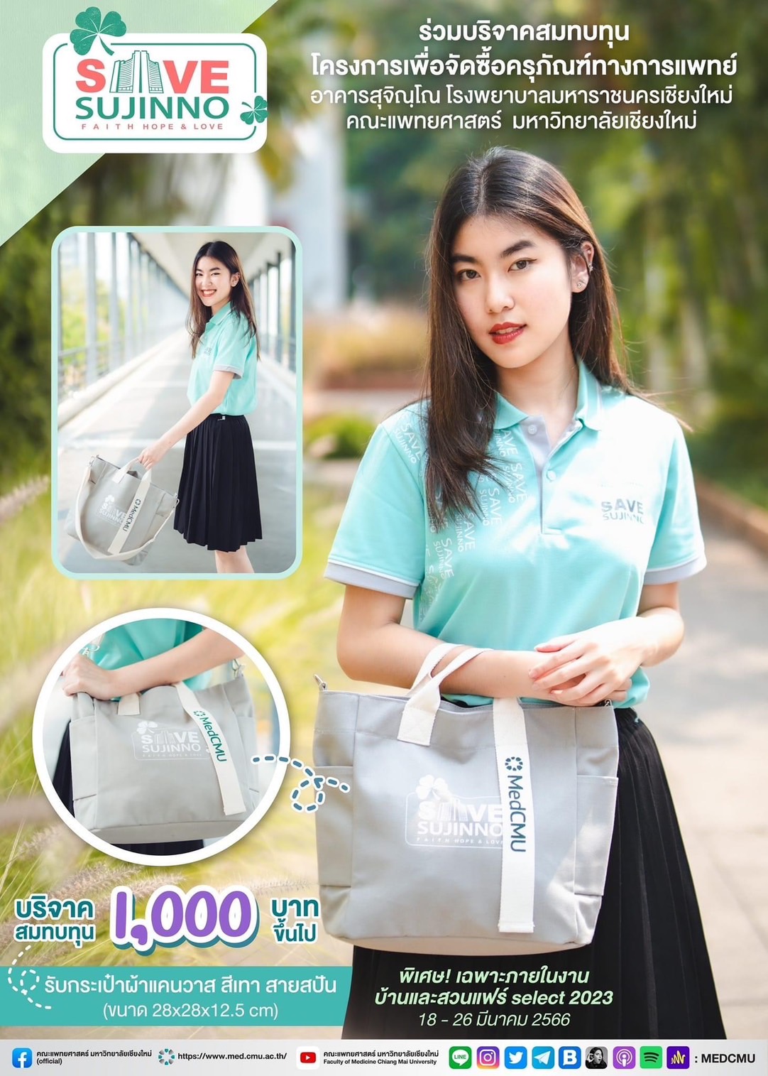 มูลนิธิโรงพยาบาลสวนดอก คณะแพทยศาสตร์ มหาวิทยาลัยเชียงใหม่ ร่วมออกบูธนิทรรศการ เชิญชวนประชาชนร่วมทำบุญในโครงการประชาสัมพันธ์มูลนิธิโรงพยาบาลสวนดอก เพื่อโครงการจัดซื้อครุภัณฑ์ทางการแพทย์อาคารสุจิณฺโณ และเพื่อผู้ป่วยยากไร้ ในงาน “บ้านและสวนแฟร์ Select 2023” ระหว่างวันที่ 18 – 26 มีนาคม 2566 เวลา 9.30 – 21.00 น. ณ ศูนย์นิทรรศการและการประชุมไบเทค บางนา กรุงเทพมหานคร (บูธตั้งอยู่ด้านขวามือใกล้ประตูทางเข้า EH103) และพิเศษเฉพาะในงาน “บ้านและสวนแฟร์ Select 2023” ผู้บริจาคตั้งแต่ 1,000 บาทขึ้นไป จะได้รับกระเป๋าผ้าแคนวาส สีเทา สายสปัน เป็นที่ระลึก(จำนวนจำกัด)