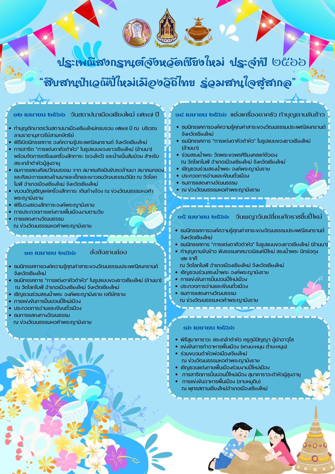 สำหรับการจัดกิจกรรมประเพณีสงกรานต์จังหวัดเชียงใหม่ ประจำปี 2566 ที่ตั้งแต่วันที่ 12-17 เมษายน นี้ สำนักงานวัฒนธรรมจังหวัดเชียงใหม่ร่วมกับหลายภาคส่วนจัดกิจกรรมประเพณีสงกรานต์ โดยมีกิจกรรมหลากหลายทั้ง การทำบุญตักบาตรเนื่องในวันสถาปนาเมืองเชียงใหม่ 727 ปี การจัดนิทรรศการ องค์ความรู้ประเพณีสงกรานต์จังหวัดเชียงใหม่ สาธิต “การแต่งดาคัวดำหัว” ในรูปแบบของชาวเชียงใหม่ การแสดงศิลปวัฒนธรรมขับซอล้านนา และพิธีบวงสรวงสักการะองค์พระญามังราย การแข่งขันปั๋นปอนปี๋ใหม่เมือง การอ่านและเขียนตัวเมือง กิจกรรมการตัดช่อตุง ก่อเจดีย์ทราย และกิจกรรมอื่นๆ อีกมากมาย ซึ่งประชาชนและนักท่องเที่ยวสามารถร่วมกิจกรรมได้ ณ วัดอินทขิล วัดโลกโมฬี และข่วงวัฒนธรรม หอคำพระญามังราย อำเภอเมืองเชียงใหม่ จังหวัดเชียงใหม่