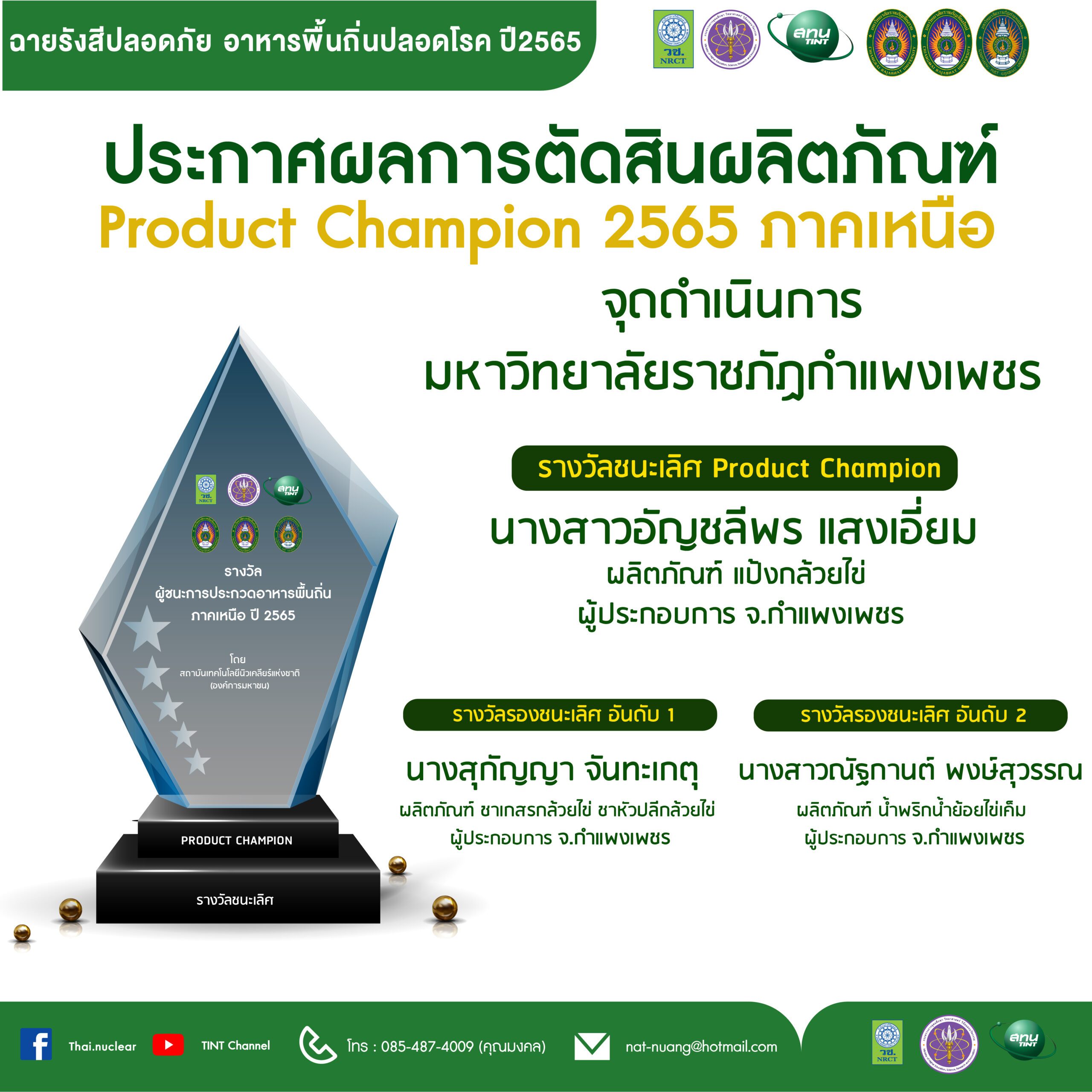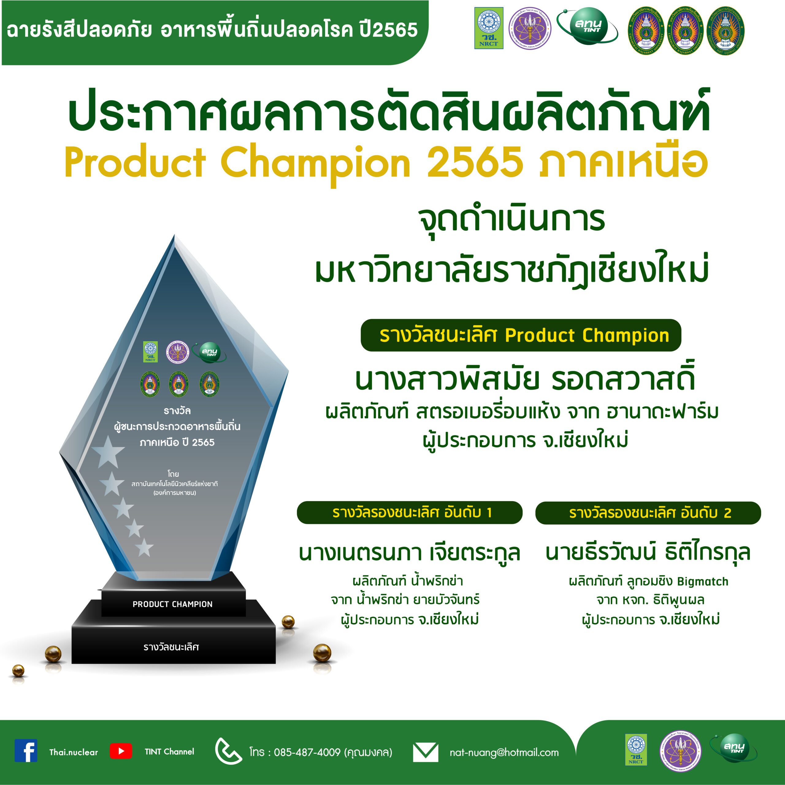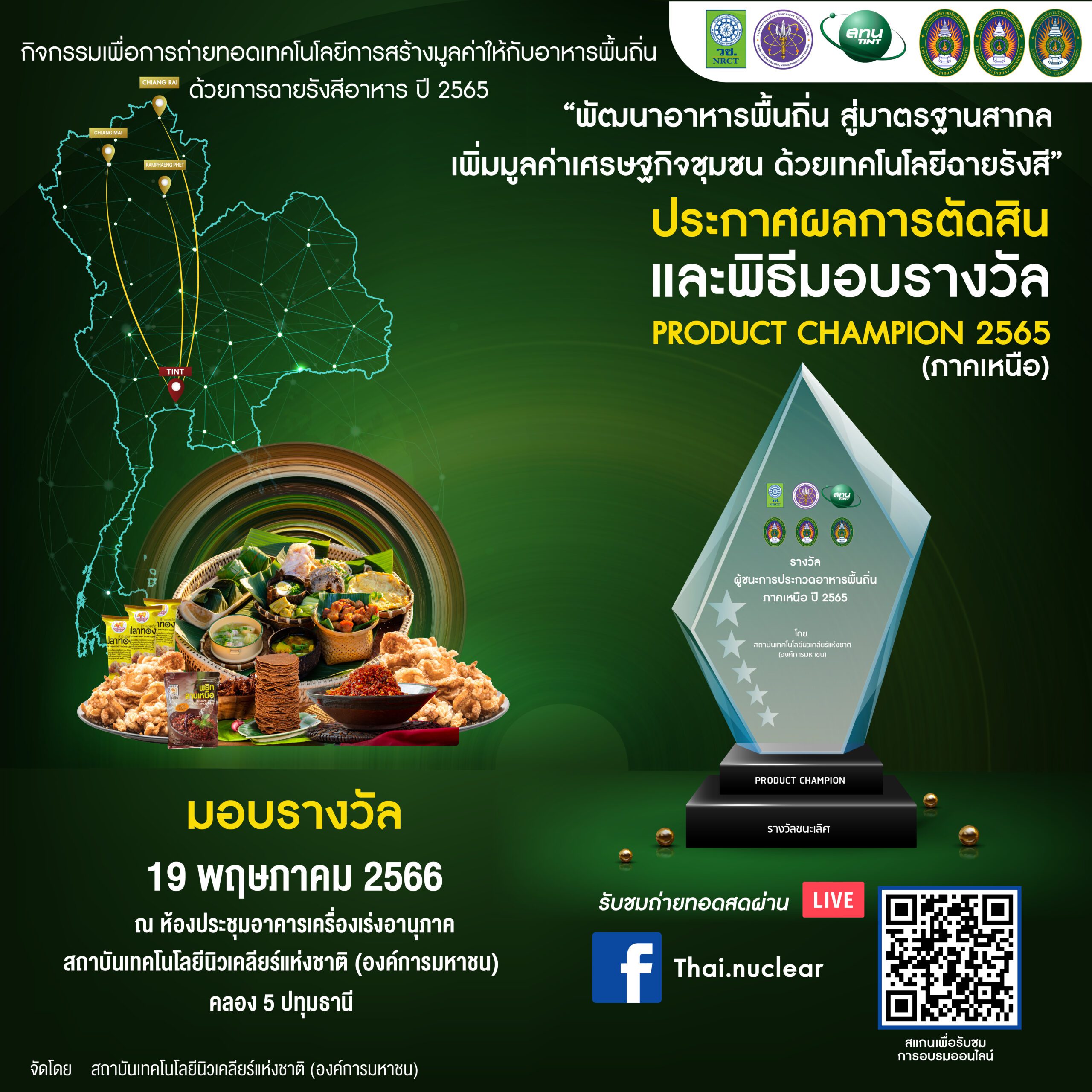 ทั้งนี้จะได้มีพิธีมอบรางวัล Product Champion 2565 (ภาคเหนือ) ในวันศุกร์ที่ 19 พฤษภาคม 2566 ณ ห้องประชุมอาคารเครื่องเร่งอานุภาค สถาบันเทคโนโลยีนิวเคลียร์แห่งชาติ (องค์การมหาชน) คลอง 5 อ.คลองหลวง จ.ปทุมธานี ผู้สนใจสามารถติดตามชมการถ่ายทอดสดได้ทาง Facebook Fanpage : สถาบันเทคโนโลยีนิวเคลียร์แห่งชาติ ตั้งแต่เวลา 09.00 น. เป็นต้นไป โดยผู้ชนะเลิศในแต่ละจุดดำเนินการจะได้รับเงินรางวัล มูลค่า 10,000 บาท รางวัลรองชนะเลิศอันดับที่ 1 และ 2 รวมถึงรางวัลชมเชย จะได้รับโล่และใบประกาศจากสถาบันเทคโนโลยีนิวเคลียร์แห่งชาติ (องค์การมหาชน)