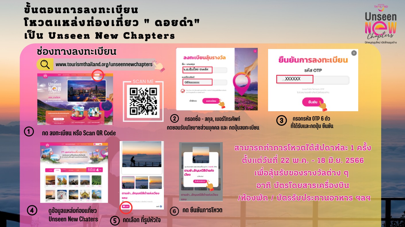 จึงขอเชิญชวนชาวเชียงใหม่ ร่วมโหวตให้ “จุดชมวิวดอยดำ” เป็น 1 ใน 20 แหล่งท่องเที่ยวสุด Unseen แห่งใหม่ของเมืองไทย ในปี 2023 ผ่าน www.tourismthailand.org/unseennewchapters ตั้งแต่วันนี้-วันที่ 18 มิถุนายน 2566 โดย 1 คน สามารถโหวตได้ 5 สิทธิ์ต่อสัปดาห์ (1 สิทธิ์ ต่อ 1 ภาค) ผู้ร่วมสนุกจะได้รับสิทธิ์ลุ้นรับของรางวัล อาทิ ตั๋วเครื่องบินไป-กลับ ภายในประเทศ ห้องพัก โรงแรมภายในประเทศ และบัตรกำนัลรถเช่าจาก AVIS