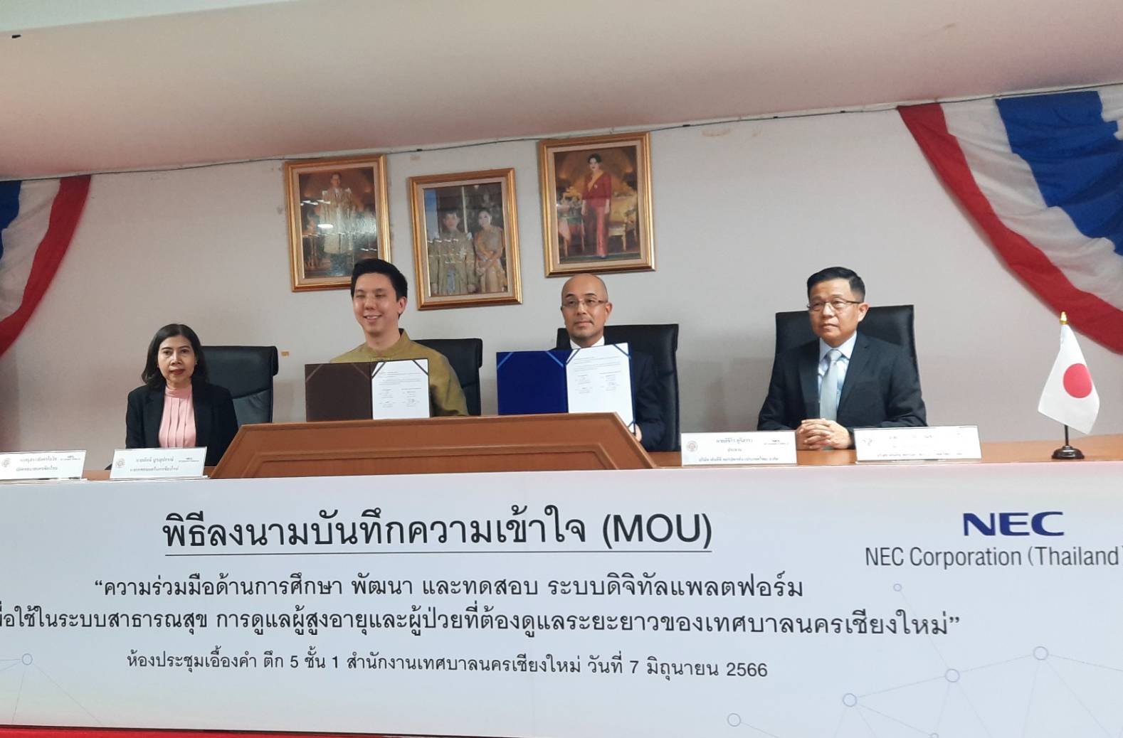 วันที่ 7 มิถุนายน 2566 ที่สำนักงานเทศบาลนครเชียงใหม่ ได้มีการลงนามบันทึกความร่วมมือ (MOU) ด้านการศึกษา พัฒนา และทดสอบ ระบบดิจิทัลแพลตฟอร์มเพื่อใช้ในระบบสาธารณสุขการดูแลผู้สูงอายุและผู้ป่วยที่ต้องดูแลระยะยาว ระหว่าง เทศบาลนครเชียงใหม่ และ บริษัท เอ็นอีซี คอร์ปอเรชั่น (ประเทศไทย) จำกัด โดยมีนายอัศนี บูรณุปกรณ์ นายกเทศมนตรีนครเชียงใหม่ เป็นประธานในพิธีและร่วมลงนาม กับนายอิชิโร่ คูริฮารา ประธานกรรมการบริหาร พร้อมด้วย นางนุสรา ยันตรโกวิท ปลัดเทศบาลนครเชียงใหม่, นายอิสรา โกยวาณิชย์ ผู้ช่วยกรรมการบริหาร เอ็นอีซี ประเทศไทย