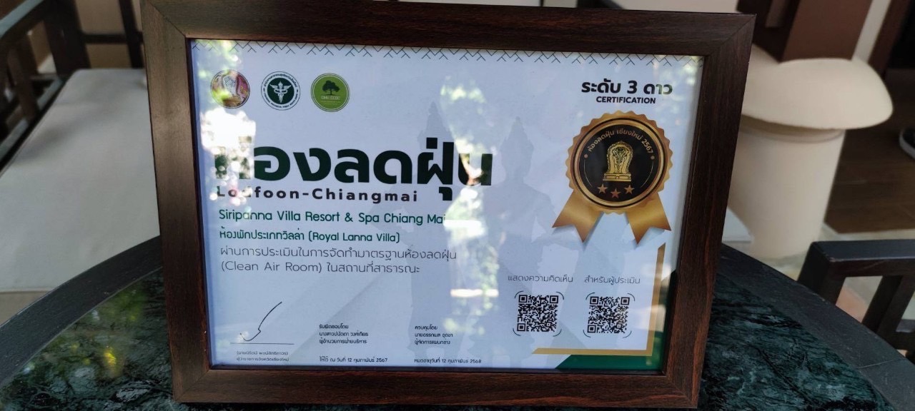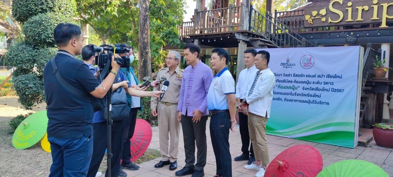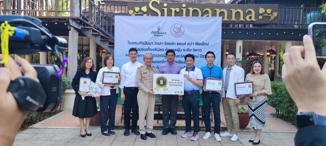 ในการนี้ นายทศพล เผื่อนอุดม รองผู้ว่าราชการจังหวัดเชียงใหม่ ได้กล่าวชื่นชมการดำเนินการของโรงแรมศิริปันนาฯ และร่วมมอบใบประกาศนียบัตรรับรอง “ห้องลดฝุ่น” ระดับ 3 ดาว จำนวน 3 ห้อง พร้อมทั้งขอความร่วมมือทุกภาคส่วนดำเนินการตามมาตรการป้องกันและลดผลกระทบจากสถานการณ์ฝุ่นละอองขนาดเล็กฯ ด้านสุขภาพ ฉบับที่ 1 โดยสามารถศึกษาข้อมูลเพิ่มเติมได้ที่ www.lodfoon.com