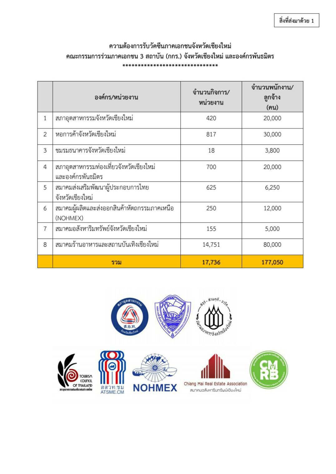 ทั้งนี้มีรายงานเบื้องต้นว่า คณะกรรมการร่วมภาคเอกชน 3 สถาบัน หรือ กกร. จังหวัดเชียงใหม่ และองค์กรพันธมิตร ได้แจ้งความต้องการรับวัคซีนภาคเอกชนของจังหวัดเชียงใหม่มีอยู่ราว 177,050 คน แยกเป็น สมาชิกสภาอุตสาหกรรมจังหวัดเชียงใหม่ 420 กิจการ 20,000 คน หอการค้าจังหวัดเชียงใหม่ 817 กิจการ 30,000 คน ชมรมธนาคารจังหวัดเชียงใหม่ 18 กิจการ 3,800 คน สภาอุตสาหกรรมท่องเที่ยวจังหวัดเชียงใหม่และองค์กรพันธมิตร 700 กิจการ 20,000 คน สมาคมส่งเสริมพัฒนาผู้ประกอบการไทยจังหวัดเชียงใหม่ 625 กิจการ 6,250 คน สมาคมผู้ผลิตและส่งออกสินค้าหัตถกรรมภาคเหนือ (NOHMEX) 250 กิจการ 12,000 คน สมาคมอสังหาริมทรัพย์จังหวัดเชียงใหม่ 155 กิจการ 5,000 คน และสมาคมร้านอาหารและสถานบันเทิงเชียงใหม่ 14,751 กิจการ 80,000 คน นอกจากนี้ยังมีชมรมธุรกิจรถเช่าจังหวัดเชียงใหม่ อีก 131 คน ซึ่งแจ้งความประสงค์แล้วว่า พร้อมฉีดวัคซีน