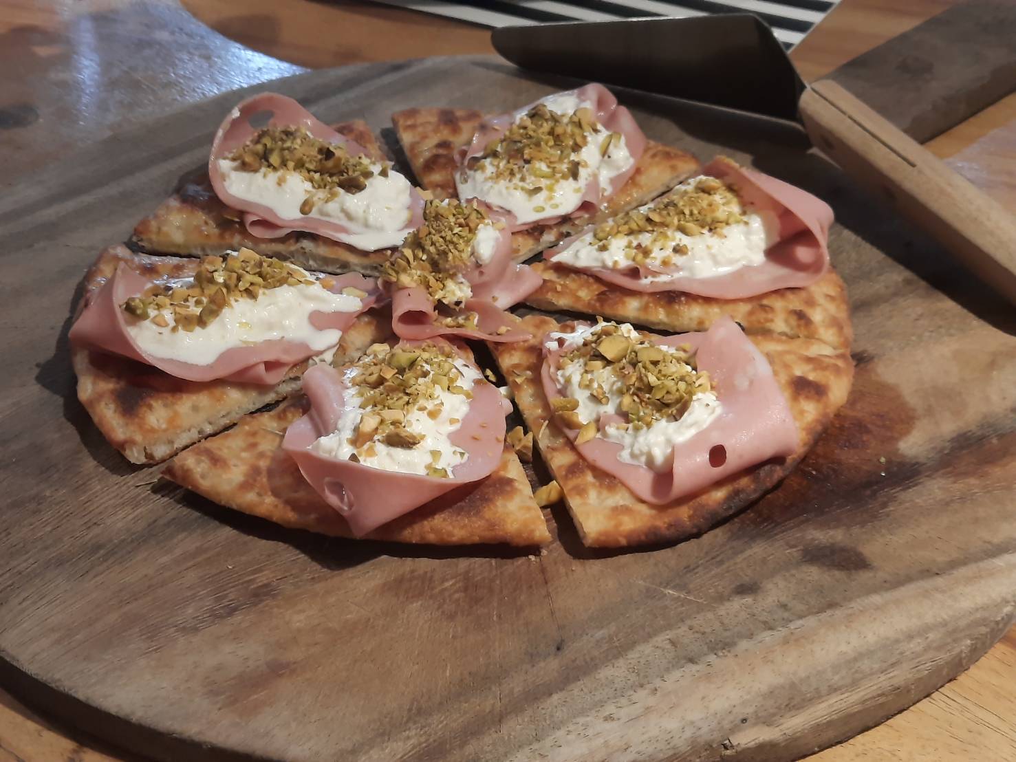พิซซ่าขนมปังสูตรอร่อยเสริฟเต็มชิ้นกับBolona Salami ครีมชีสสดโรยฉ่ำๆ กับถั่วพิตาชิโอ้อบ