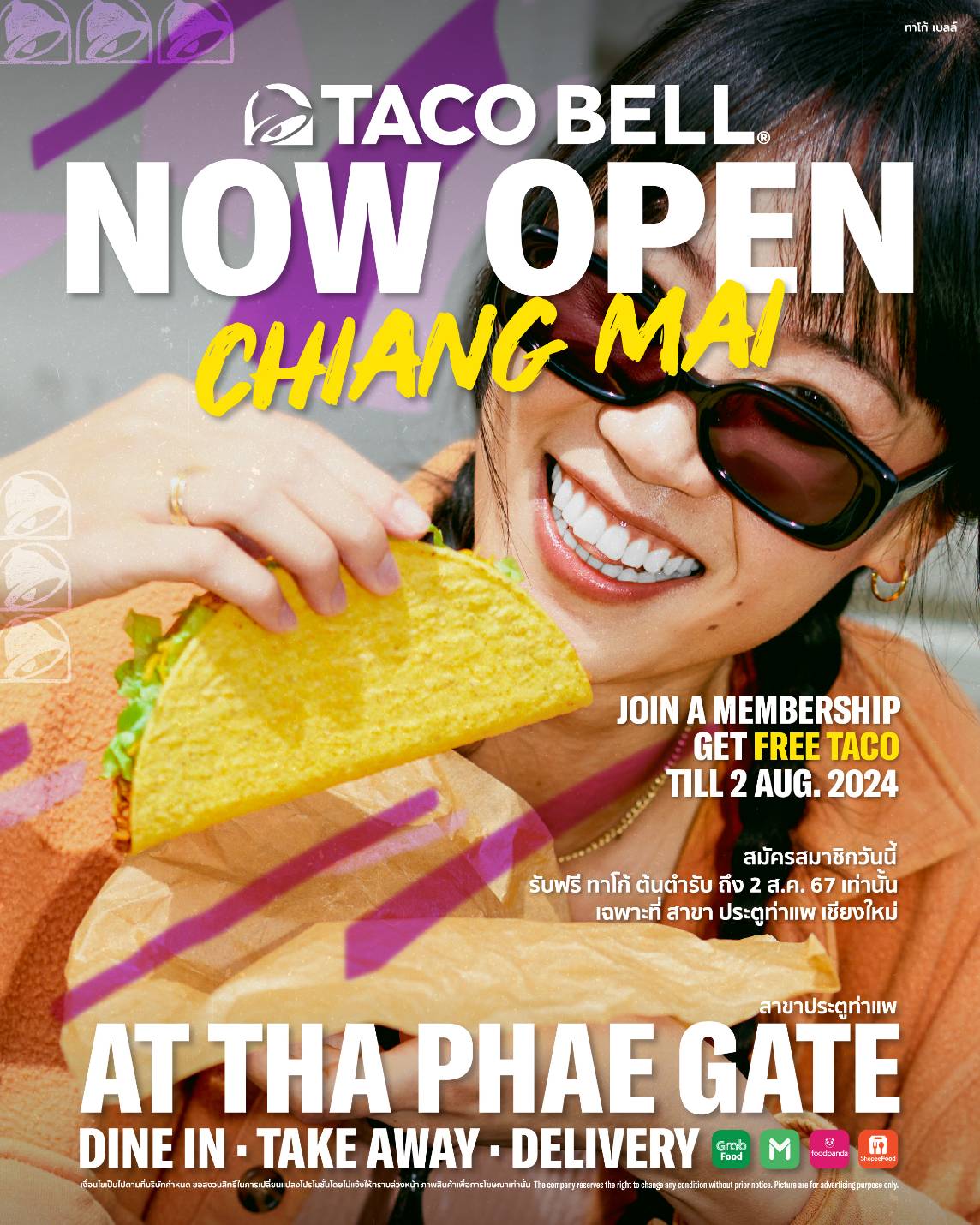 2 สิงหาคม 2567 : บริษัท สยาม ทาโก้ จำกัด ซึ่งเป็นผู้บริหารแฟรนไชส์ ทาโก้ เบลล์ (Taco Bell) ร้านอาหารสไตล์กึ่งเม็กซิกันที่มีชื่อเสียงจากสหรัฐอเมริกา ได้ฤกษ์เปิดสาขาแรกในภาคเหนือที่ ประตูท่าแพ จ.เชียงใหม่ พร้อมจัดโปรโมชันพิเศษสุด เพื่อเปิดโอกาสให้นักท่องเที่ยวชาวไทยและชาวต่างชาติ ได้ลิ้มลองเมนูทาโก้ต้นตำรับจากอเมริกา ด้วยกติกาง่ายๆ เพียงลูกค้าสมัครสมาชิก ผ่าน Line Official Account : @Tacobellthai รับฟรี Crunchy Taco (จำกัด 100 สิทธิ์ / วัน) ถึงวันที่ 2 สิงหาคม 2567 และเมื่อสั่งอาหารครบ 350 บาทขึ้้นไป พร้อมกับเช็คอินที่ Facebook Taco Bell Thailand รับฟรี Loaded Nacho เริ่มตั้งแต่วันนี้ ถึง 15 สิงหาคม 2567
