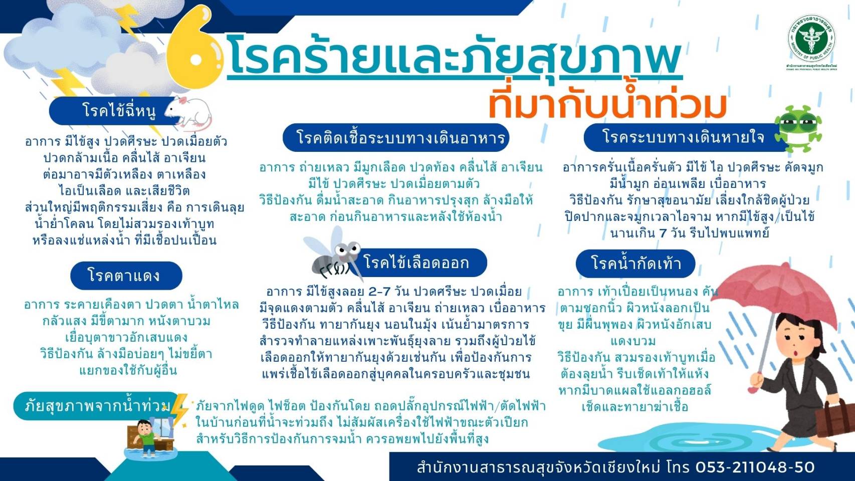 นอกจากนี้ ฤดูฝนยังเป็นช่วงที่มีความเสี่ยงสูงต่อโรคอื่น ๆ เช่น โรคไข้เลือดออก โรคตาแดง โรคระบบทางเดินหายใจ โรคติดเชื้อระบบทางเดินอาหาร โรคน้ำกัดเท้า ประชาชนควรป้องกันตนเองโดยการหลีกเลี่ยงการเดินลุยน้ำ สวมชุดป้องกันไม่ให้เชื้อโรคเข้าสู่ผิวหนัง ใส่รองเท้าบูทกันน้ำ ล้างมือบ่อย ๆ และหลีกเลี่ยงการสัมผัสน้ำที่มีสิ่งปนเปื้อน ทายากันยุงป้องกันไม่ให้ยุงหรือสัตว์อื่นๆ กัด ดื่มน้ำสะอาด รับประทานอาหารปรุงสุกใหม่ รักษาความสะอาดของสิ่งแวดล้อม กำจัดขยะและแหล่งเพาะพันธุ์ยุงอย่างสม่ำเสมอ รวมถึงการป้องกันตัวเองจากดินถล่ม ภัยจากไฟดูด ไฟช็อต ป้องกันโดย ถอดปลั๊กอุปกรณ์ไฟฟ้า/ตัดไฟฟ้าในบ้านก่อนที่น้ำจะท่วมถึง ไม่สัมผัสเครื่องใช้ไฟฟ้าขณะตัวเปียก สำหรับวิธีการป้องกันการจมน้ำ ควรอพยพไปยังพื้นที่สูง ไม่ควรขับรถผ่านบริเวณที่มีน้ำท่วม ระดับน้ำเพียง 6 นิ้ว สามารถทำให้รถเสียหลักล้มได้ หากมีข้อสงสัยหรือพบปัญหาเกี่ยวกับสุขภาพ สามารถติดต่อสอบถามข้อมูลเพิ่มเติมได้ที่สายด่วนสาธารณสุขจังหวัดเชียงใหม่ โทร. 1422 ตลอด 24 ชั่วโมง