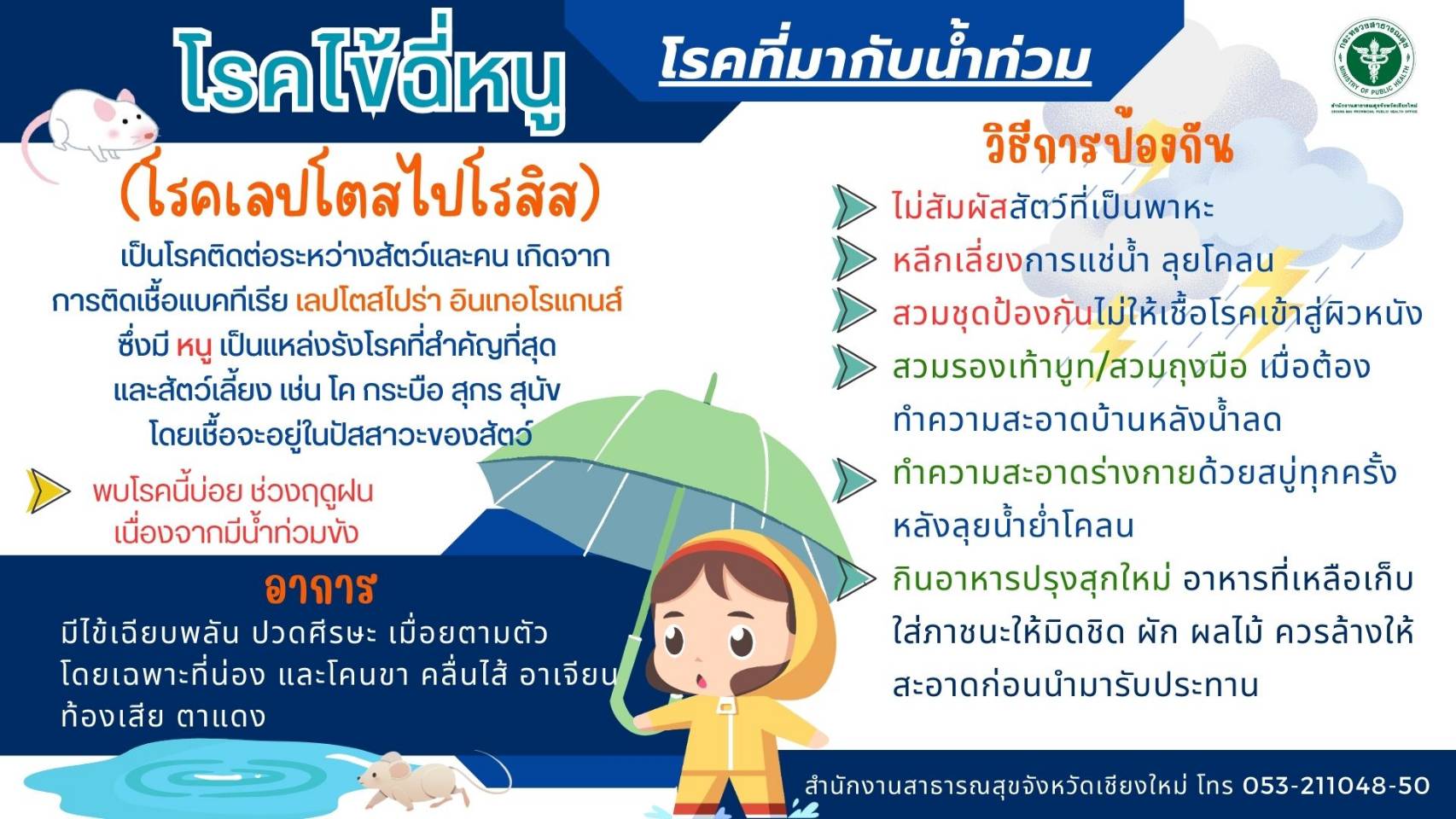 สำนักงานสาธารณสุขจังหวัดเชียงใหม่เตือนประชาชนให้ระมัดระวังโรคฉี่หนูและโรคอื่น ๆ ที่มักเกิดขึ้นในช่วงฤดูฝน โดยเฉพาะในพื้นที่ที่มีน้ำท่วมขัง หรือบริเวณที่มีความเสี่ยงสูงต่อการสัมผัสเชื้อโรคจากสัตว์พาหะ