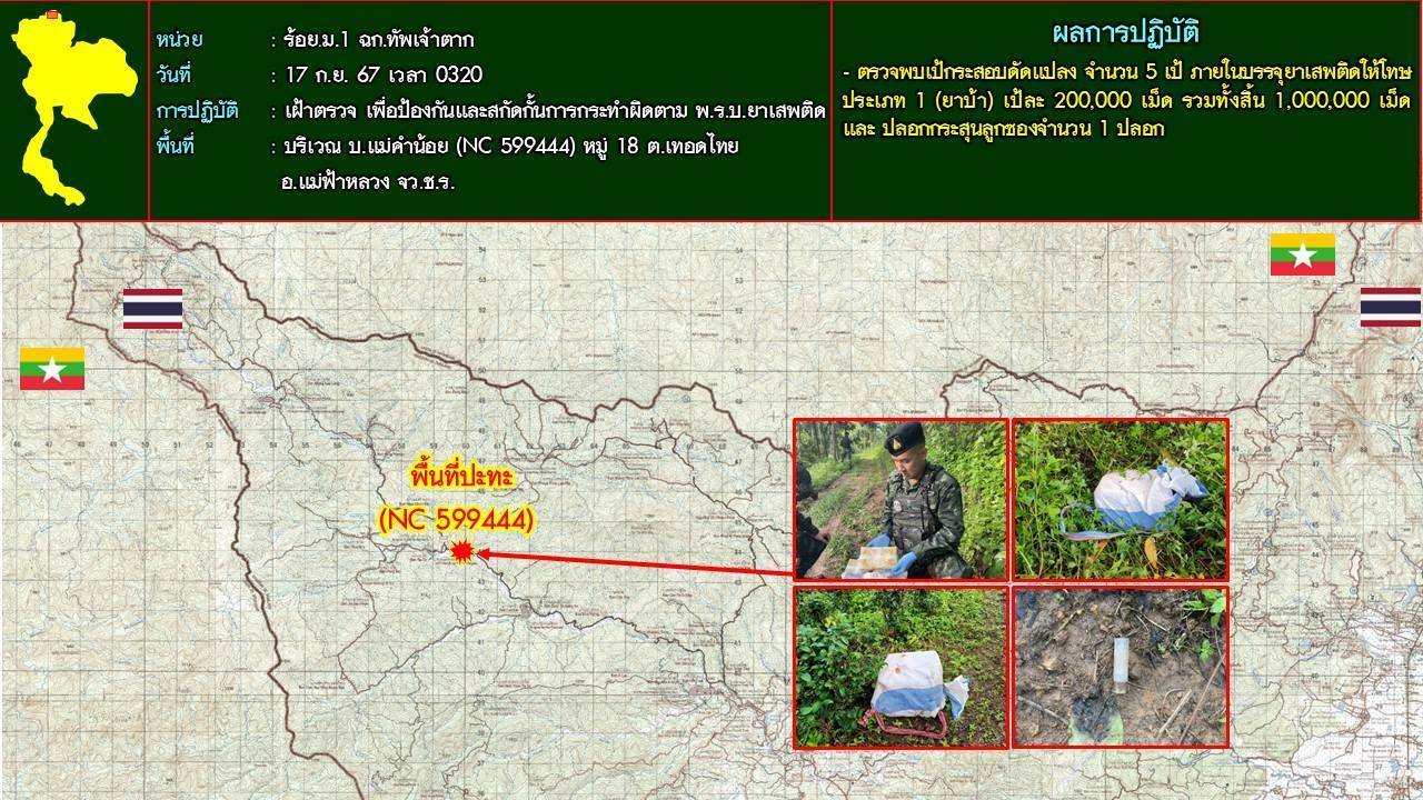 ต่อมาเมื่อเวลา 0630 หน่วยได้เข้าตรวจสอบที่เกิดเหตุ ผลการปฏิบัติ ตรวจพบเป้กระสอบดัดแปลง จำนวน 5 เป้ ภายในบรรจุยาบ้าเป้ละประมาณ 200,000 เม็ด รวมทั้งสิ้น 1,000,000 เม็ด ไม่พบกลุ่มขบวนการฯ ปัจจุบันอยู่ในระหว่าง จนท. ที่เกี่ยวข้องเข้ามาทำการตรวจสอบที่เกิดเหตุเพิ่มเติม