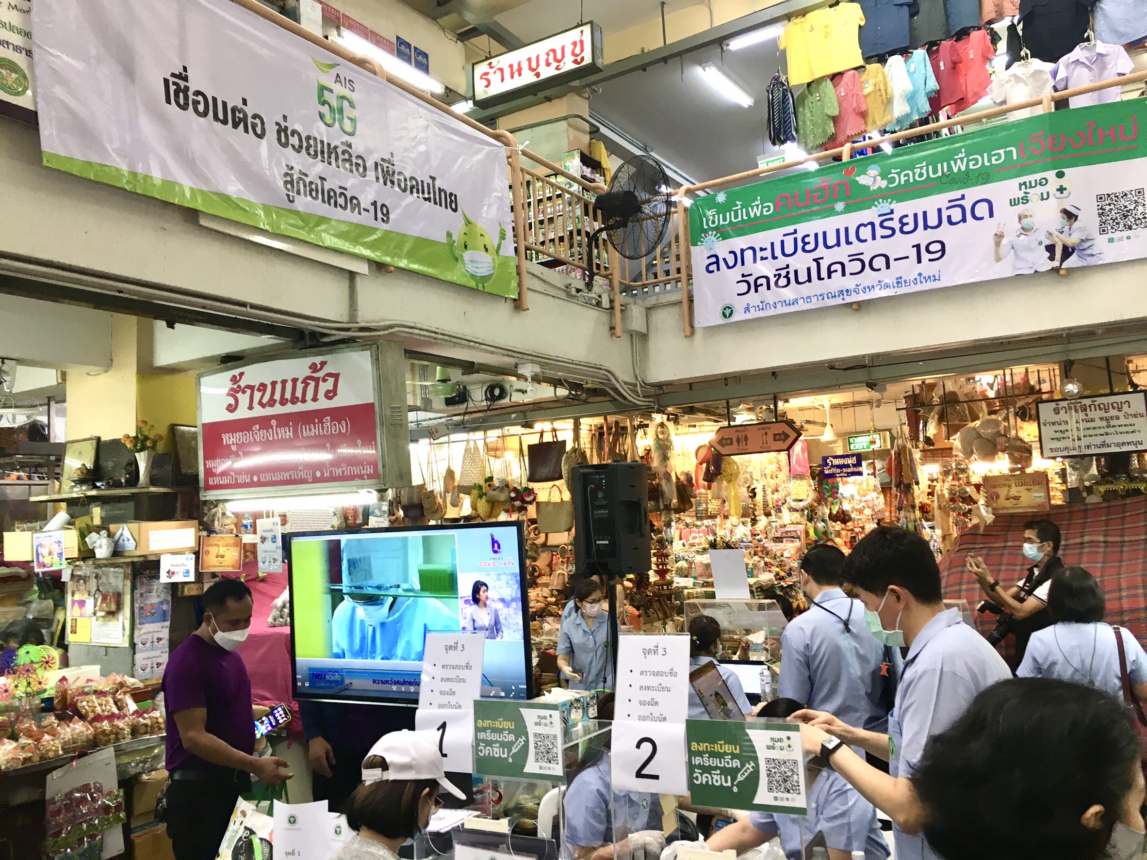 หนึ่งในแผนการรับมือการแพร่ระบาดของโรค COVID-19 ของภาคสาธารณสุขคือการฉีดวัคซีนให้กับประชาชนทั่วไป โดยเฉพาะในกลุ่มเสี่ยง อาทิ ผู้สูงอายุและผู้มีโรคประจำตัว โดยล่าสุด เอไอเอส ร่วมเชื่อมต่อเครือข่ายสื่อสาร สนับสนุนการปฏิบัติภารกิจ หน่วยลงทะเบียนฉีดวัคซีนเฉพาะกิจ สาธารณสุขจังหวัดเชียงใหม่ ร่วมเสริมสร้างภูมิคุ้มกันเชิงรุกในพื้นที่ต่างๆ อาทิ ตลาดวโรรส ,ตลาดธานินทร์ และตลาดต้นพยอม