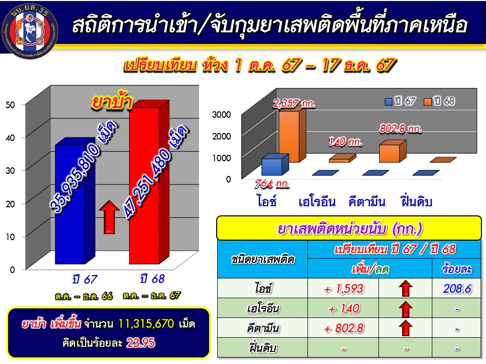 จากสถานการณ์ด้านการข่าว พบว่ายาเสพติดยังคงพักคอยอยู่ตามแนวชายแดนในปริมาณมากเช่นเดิม แต่รูปแบบการลำเลียงมีความหลากหลาย โดยเฉพาะการลำเลียงผ่านระบบขนส่งสินค้าและพัสดุภัณฑ์ ยานพาหนะที่มีการดัดแปลง รวมถึง การซุกซ่อนปะปนมากับสินค้าทางการเกษตร โดยเฉพาะช่วงของเทศกาลปีใหม่ที่มีวันหยุดติดต่อกันหลายวัน และมีนักท่องเที่ยวเดินทางเข้ามาท่องเที่ยวในภาคเหนือ รวมทั้งจากการตรวจยึดเคมีภัณฑ์ควบคุมจำนวนมาก ในพื้นที่ อำเภอแม่สอด จังหวัดตาก เป็นสิ่งบอกเหตุได้ชัดเจนว่ากลุ่มผู้ผลิตยังคงมีความต้องการเคมีภัณฑ์เหล่านี้ นำไปใช้ในกระบวนการผลิตยาเสพติด ทั้งนี้ที่ผ่านมา นบ.ยส.35 จึงได้ร่วมกับ ปปส. ภาค 5 และภาค 6 เพิ่มมาตรการเฝ้าตรวจและสกัดกั้นให้เข้มข้นขึ้น โดยเฉพาะการลาดตระเวนตามแนวชายแดน การตั้งจุดตรวจระหว่างอำเภอเป้าหมาย ตลอดจนการอาศัยการข่าวจากหน่วยความมั่นคง เพื่อสกัดกั้นกลุ่มขบวนการลำเลียงยาเสพติดไว้ ณ พื้นที่ชายแดนให้มากที่สุด