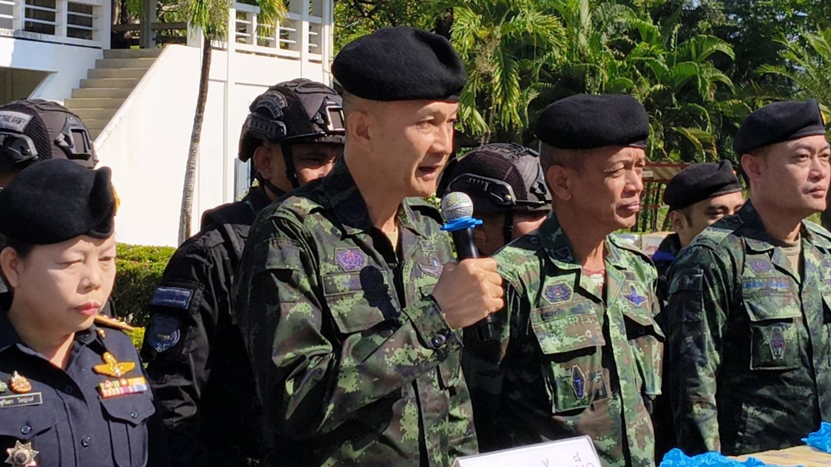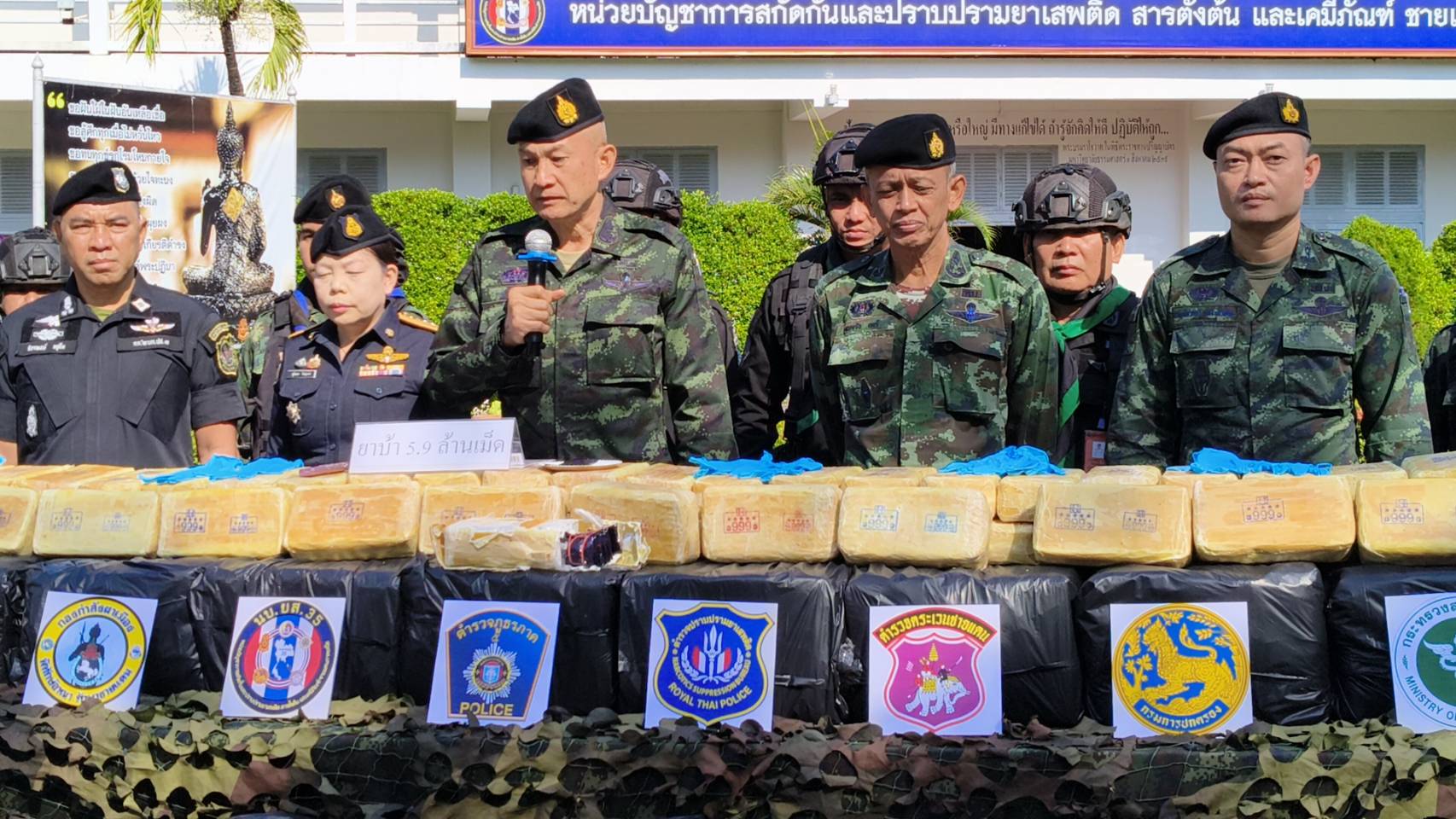 วันที่ 25 ธ.ค. 67 เวลา 10.30 น. ที่หน่วยบัญชาการสกัดกั้นและปราบปรามยาเสพติดสารตั้งต้นและเคมีภัณฑ์ ชายแดนภาคเหนือ (ผบ.นบ.ยส.35) ตำบลดอนแก้ว อำเภอแม่ริม จังหวัดเชียงใหม่ พล.ท.กิตติพงศ์ ชื่นใจชน ผบ.นบ.ยส.35 พร้อมด้วย พ.ต.อ.ทิวาพงษ์ พลูโต ผกก.2 บก.ปส.3, พ.อ.ชาญชัยวัฒน์ เปล่งสันเทียะ เลขาธิการ กอ.รมน.ภาค 3 สย.2 และนางสาวสุกันยา ใหญ่วงศ์ ผอ.ส่วนประสานพื้นที่ ปปส.ภาค 5 ได้ร่วมกันแถลงข่าวการจับกุมยาเสพติดยาบ้า จำนวน 5,900,000 เม็ด ในพื้นที่บ้านราษฎร์ภักดี ต.ตับเต่า อ.เทิง จ.เชียงราย และสรุปผลการปฏิบัติงานของ นบ.ยส.35 ไตรมาสที่ 1 (ต.ค. – ธ.ค. 67)