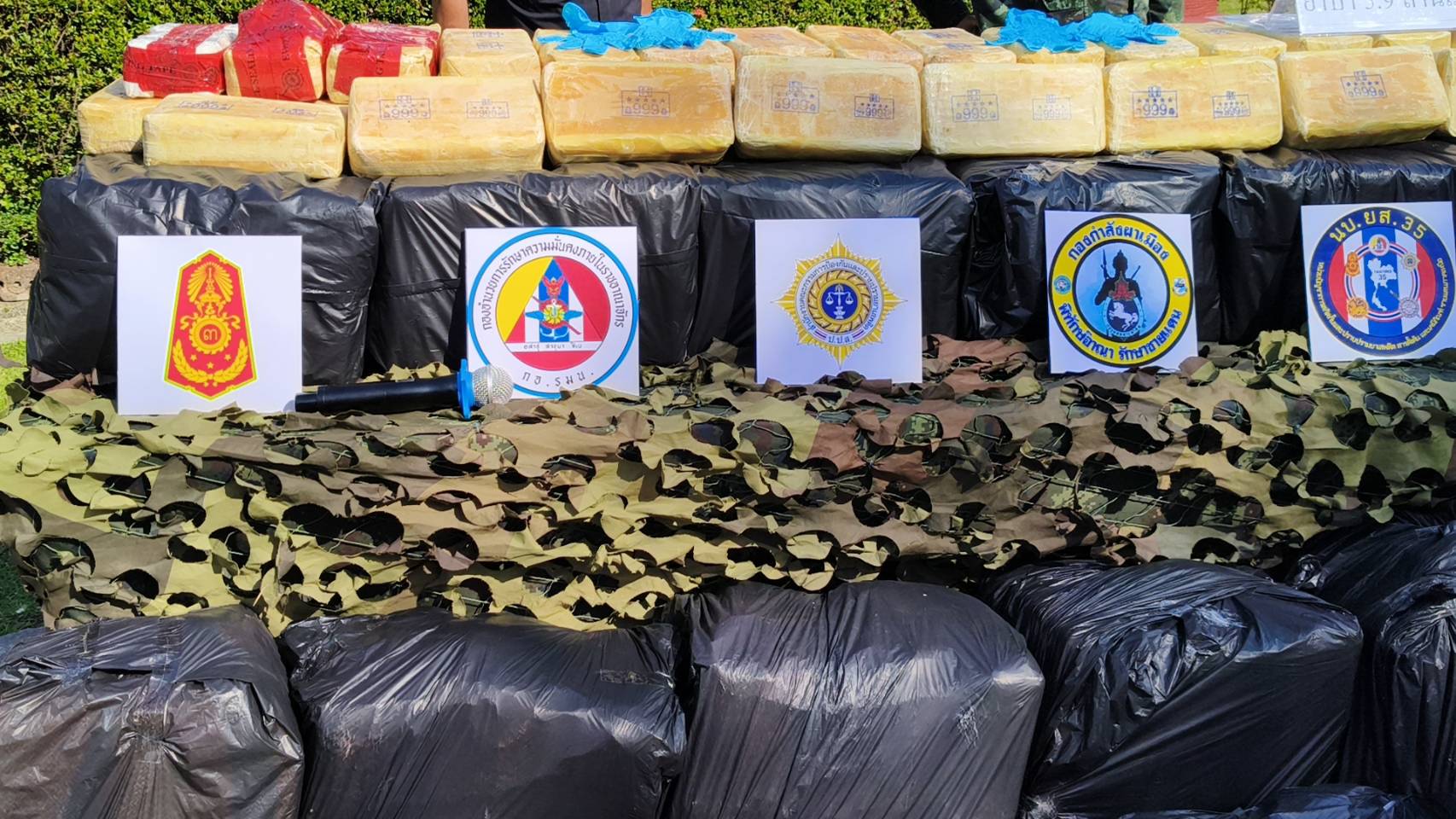 พล.ท.กิตติพงศ์ ชื่นใจชน ผบ.นบ.ยส.35 กล่าวว่า จากการบูรณาการด้านการข่าวระหว่าง นบ.ยส.35 ร่วมกับ บช.ปส. ได้ติดตามความเคลื่อนไหว ของกลุ่มขบวนการลักลอบลำเลียงยาเสพติด ในพื้นที่ อ.เวียงแก่น จ.เชียงราย โดยปรากฏข่าวว่าในห้วง วันที่ 20 – 25 ธ.ค.67 กลุ่มเครือข่ายขบวนการค้ายาเสพติดในพื้นที่ อ.เวียงแก่นฯ จะทำการส่งมอบาเสพติดให้ กลุ่มขบวนการฯจากภาคกลาง เพื่อลำเลียงเข้าสู่พื้นที่ตอนในโดยใช้เส้นทาง ภูชี้ฟ้า – บ้านราษฎร์ภักดี ต.ตับเต่า อ.เทิง จ.เชียงราย ต่อมาเมื่อ วันที่ 21 ธ.ค. 67 เวลา 21.00 น. นบ.ยส.35 จึงได้ใช้กำลังติดตามค้นหารถเป้าหมาย กระทั่งลาดตระเวนมาถึงบริเวณบ้านราษฎร์ภักดี ถนนสายภูชี้ฟ้า ได้ตรวจพบกระสอบต้องสงสัยถูกทิ้งกองไว้บริเวณข้างทาง จำนวน 20 กระสอบ เจ้าหน้าที่จึงได้ทำการตรวจสอบพบว่าเป็นยาเสพติดให้โทษประเภทที่ 1 (ยาบ้า) จำนวนทั้งสิ้น 5,900,000 เม็ด ประทับตรา 999 สีน้ำเงิน บนหีบห่อ จึงได้ยึดของกลางทั้งหมดและส่งมอบให้ สภ.เทิง เพื่อดำเนินคดีต่อไป ขณะเดียวกันยังพบว่า ลักษณะของการลักลอบลำเลียง หีบห่อและตราสัญลักษณ์คล้ายกับที่มีการตรวจยึดได้ที่ จ.ตาก เมื่อเดือนที่ผ่านมา จำนวน 12 ล้านเม็ด เพียงแต่สีหีบห่อจะต่างกันเท่านั้น