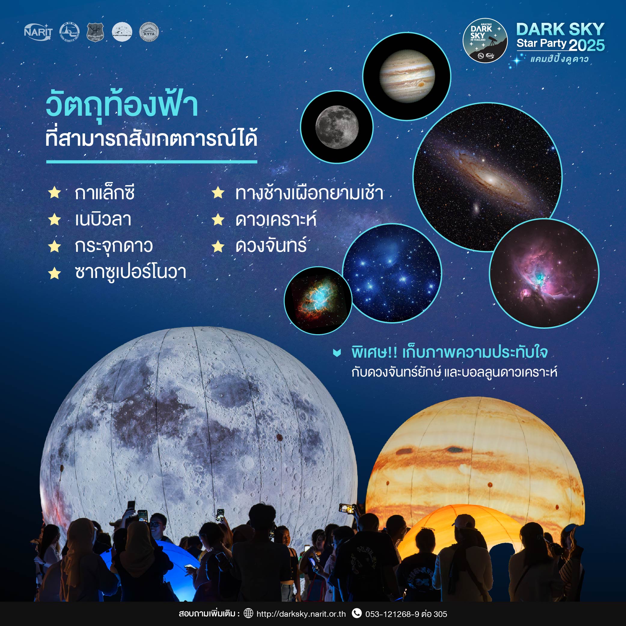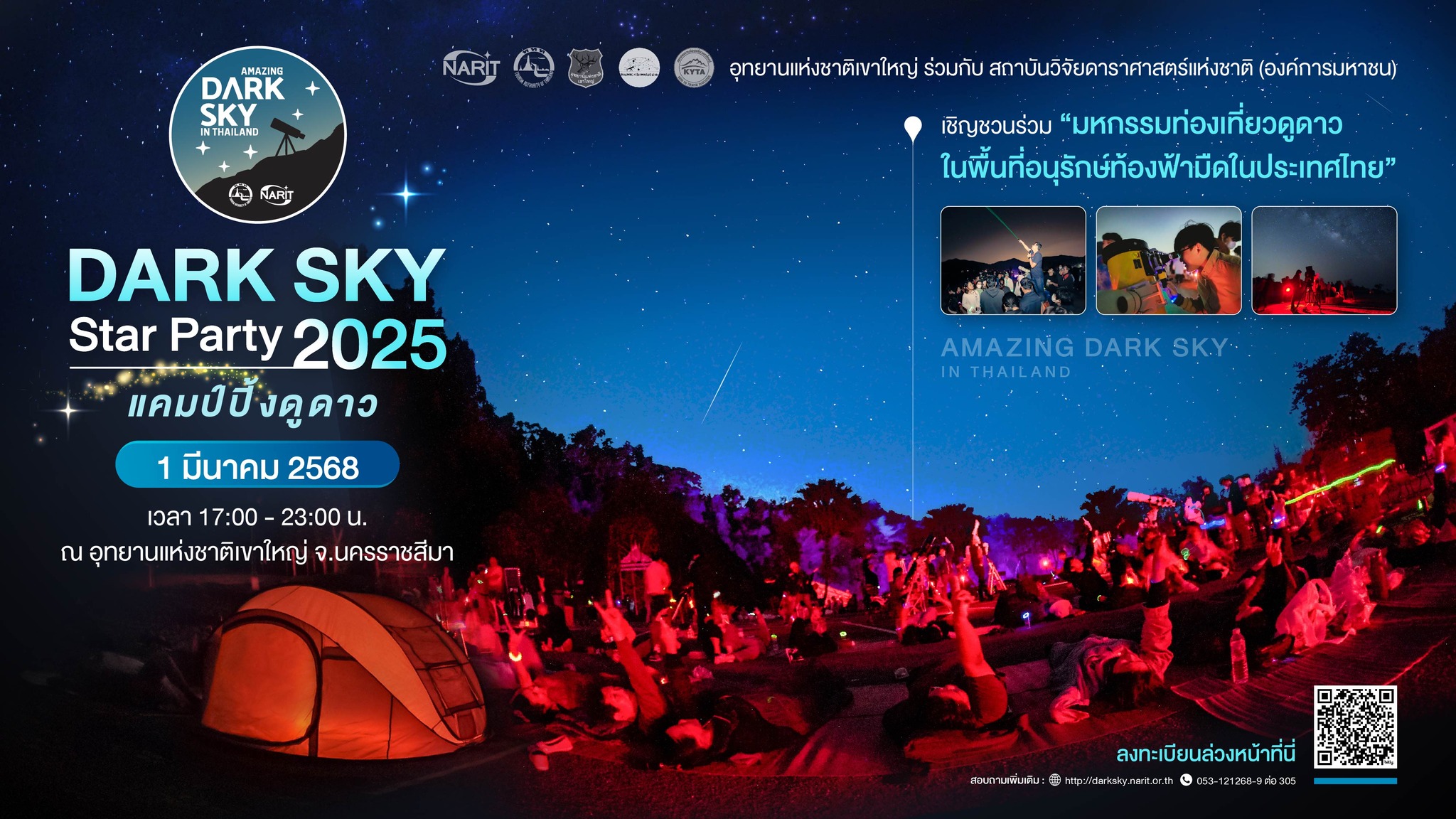 สถาบันวิจัยดาราศาสตร์แห่งชาติ (องค์การมหาชน) (สดร. หรือ NARIT) ร่วมกับ อุทยานแห่งชาติเขาใหญ่ สมาคมท่องเที่ยวเขาใหญ่ ชมรมดาราศาสตร์ปากช่อง และการท่องเที่ยวแห่งประเทศไทย ชวนร่วมมหกรรมท่องเที่ยวดูดาวในเขตอนุรักษ์ท้องฟ้ามืดในประเทศไทย “Dark Sky Star Party 2025” วันเสาร์ที่ 1 มีนาคม 2568 เวลา 17:00 – 23:00 น. ณ ลานกางเต็นท์จุดชมวิวเขาร่ม อุทยานแห่งชาติเขาใหญ่ จ. นครราชสีมา หนึ่งในพื้นที่อุทยานที่มีทัศนวิสัยท้องฟ้ายามค่ำคืนดีที่สุดแห่งหนึ่งของไทย และพื้นที่เอกชนที่ได้รับการขึ้นทะเบียนเป็นเขตอนุรักษ์ท้องฟ้ามืดของไทยมากที่สุดในประเทศ